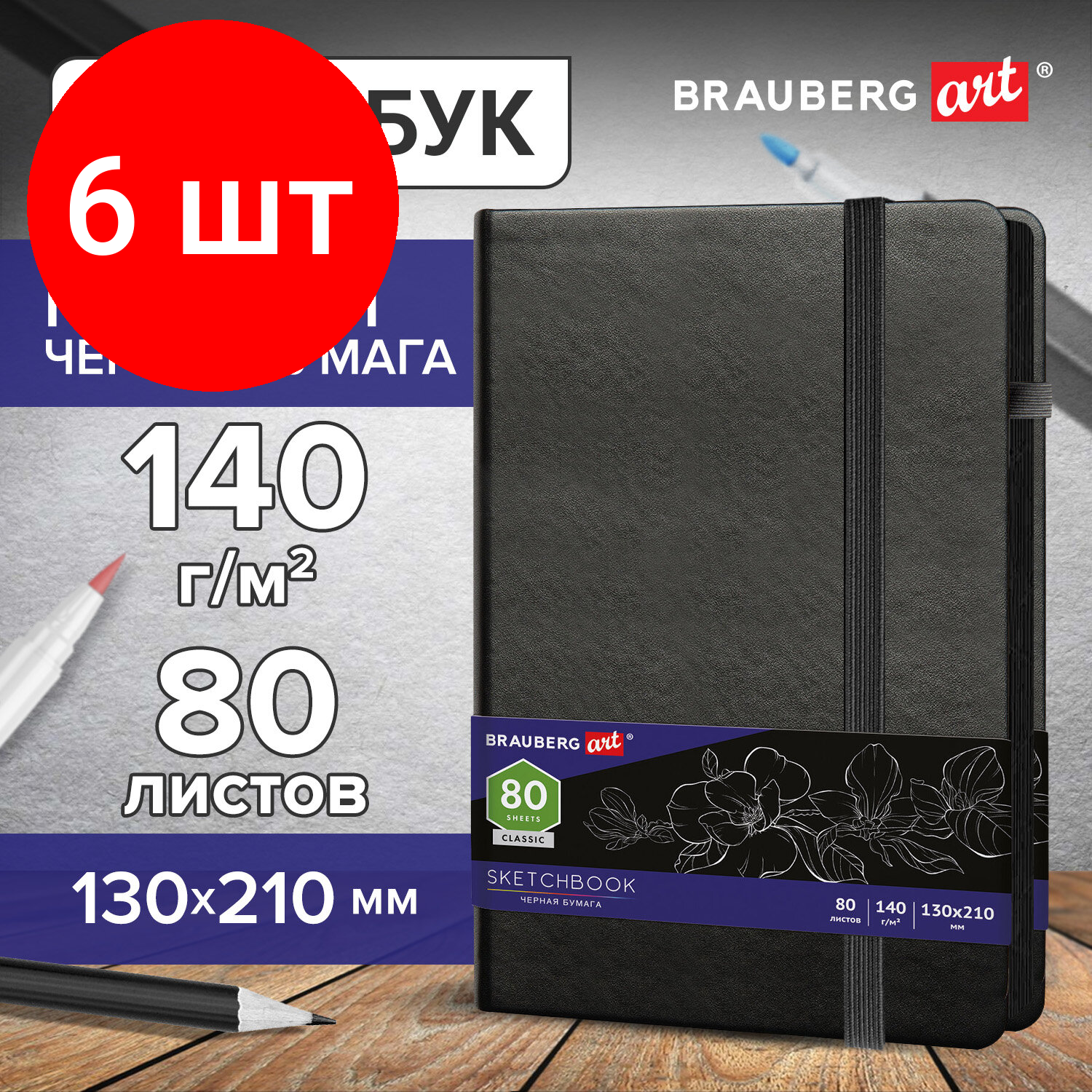 Комплект 6 шт, Скетчбук, черная бумага 140 г/м2 130х210 мм, 80 л, кожзам, резинка, карман, BRAUBERG ART, черный, 113203: сравнение цен, характеристики, фото, актуальное наличие и цены.