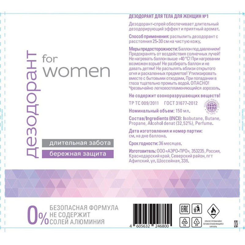 Комплект 6 штук, Дезодорант женский AERO-PRO 150мл: сравнение цен, характеристики, фото, актуальное наличие и цены.