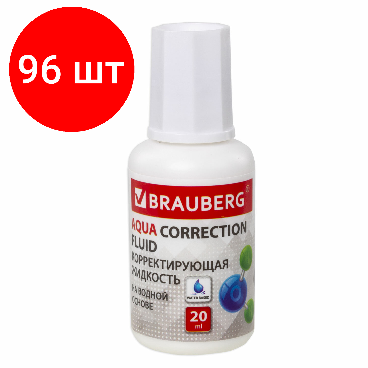 Внимание! Товар продается комплектом:[Корректирующая жидкость BRAUBERG "Aqua" на водной основе 20 мл, с кисточкой, 228643] X 96 шт. Корректирующая жидкость BRAUBERG на водной основе идеально исправляет как печатный, так и рукописный текст.
