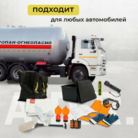 Жилет сигнальный - 1шт. Фонарь светодиодный ручной - 1шт. Перчатки химостойкие - 1 пара. Очки защитные - 1шт. Раствор для промывания глаз с ванночкой, 500 мл - 1шт. Дренажная ловушка - 1шт. Контейнер сборный, для дренажной ловушки - 1шт. Сигнальный фонарь - 2шт. Батарейка 4R25 - 2 шт. Батарейка пальчиковая - 2 шт. Лопата искробезопасная - 1шт. Инструкция ДОПОГ с аварийной карточкой - 1шт. Сумка для набора ADR (пустая) - 1шт Данное изделие имеет сертификат ГОСТ, как соответствующее всем требованиям по ДОПОГ!
