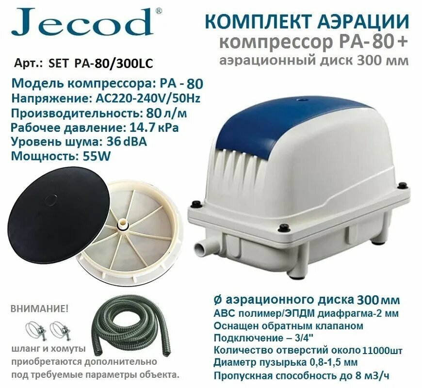 | Подробная комплектация | Компрессор PA 80 Jecod + Аэрационный диск 300LC 300 мм |