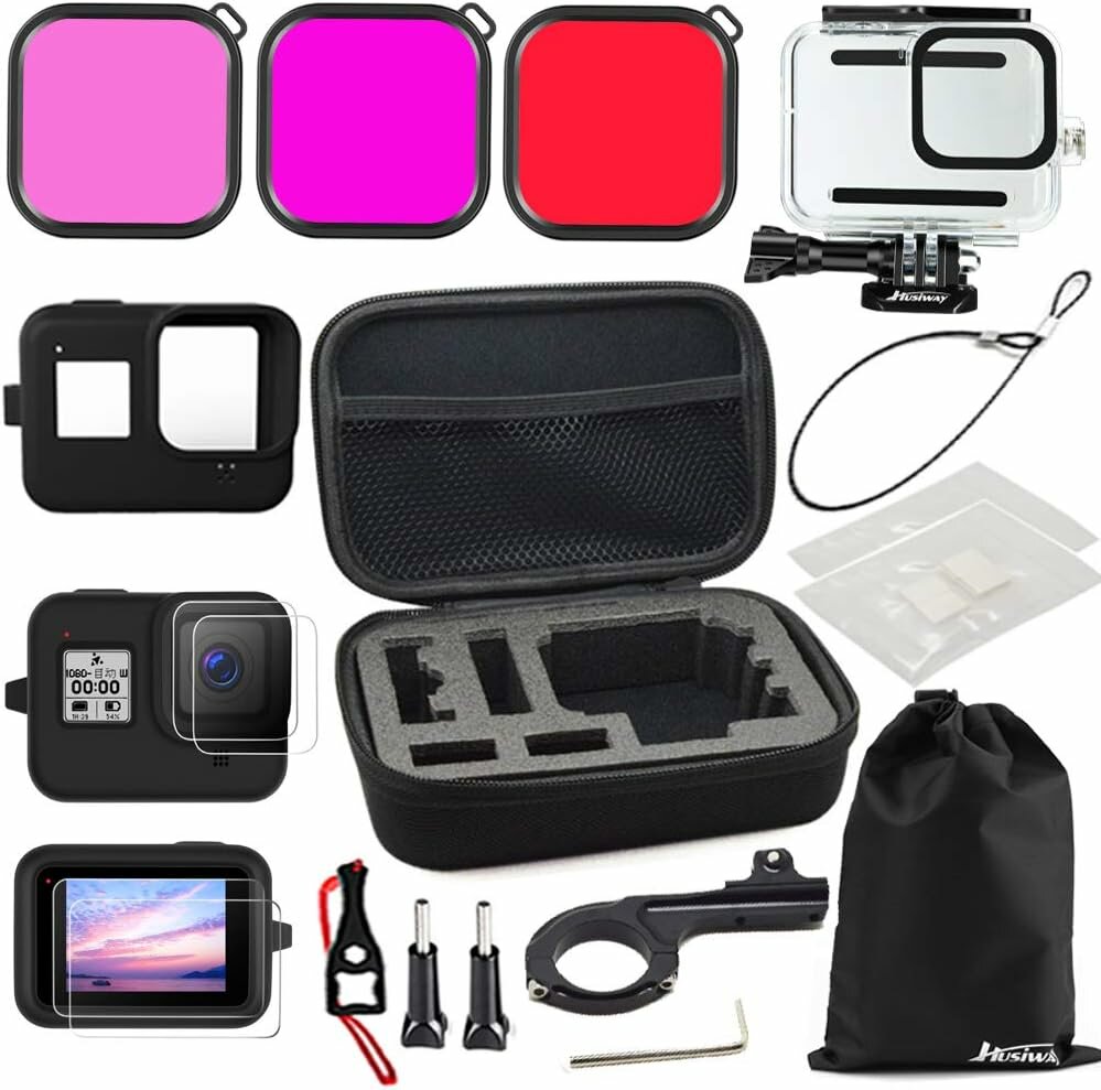Об этом товаре Все крепления в этом комплекте, разработанном специально для Gopro Hero 8 Black, идеально совместимы с Gopro Hero8. В комплект входит водонепроницаемый корпус, силиконовый чехол, защитная пленка для экрана, алюминиевое велосипедное крепление, страховочный трос из нержавеющей стали, гаечный ключ и т. д. Прочный водонепроницаемый корпус. Обеспечивает максимальную защиту вашего Gopro8 Black при экстремальных видах активного отдыха и глубоководных погружениях. Также для ежедневной защиты от вмятин и царапин. Ударопрочный чехол для переноски. Положите камеру и другие предметы в этот чехол, чтобы сохранить камеру и аксессуары GoPro Hero8 Black в целости и сохранности. Высококачественная прокладка из пенополиуретана EVA со специальными отверстиями для фиксации снаряжения. Цветные фильтры для трубки. Комплект фильтров из 3 предметов обеспечивает превосходную цветокоррекцию и улучшает контрастность на различных глубинах под водой, что позволяет получать отличные видео и фотографии. Защитная пленка для экрана высокой четкости - это закаленное стекло обладает высокой светопроницаемостью. Высокопрозрачная защитная пленка позволяет идеально отображать исходное изображение на экране Gopro8.