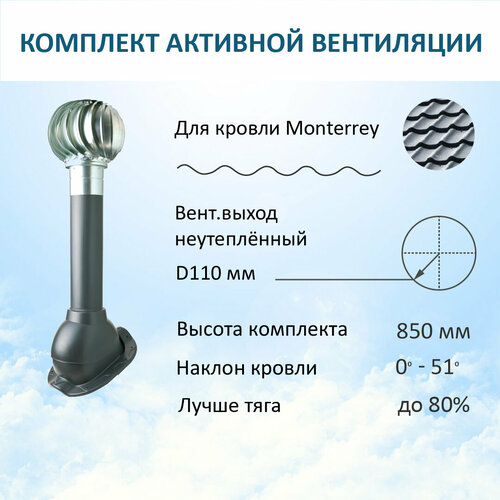 Комплект активной вентиляции: Турбодефлектор TD110 ОЦ, вент.выход 110 не утепленный, для металлочерепицы Monterrey, серый - служит для увеличения тяги в вентиляционном канале частного или многоквартирного дома, в погребе, гараже, курятнике, коровнике, конюшне, предбаннике, в парилке бани, внешней вентиляции септика и складских помещениях.