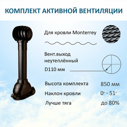 Комплект активной вентиляции: Турбодефлектор TD110, вент. выход 110 не утепленный, для металлочерепицы Monterrey, черный - служит для увеличения тяги в вентиляционном канале частного или многоквартирного дома, в погребе, гараже, курятнике, коровнике, конюшне, предбаннике, в парилке бани, внешней вентиляции септика и складских помещениях.