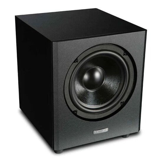 Сабвуфер изготовлен в демпфированном корпусе из толстых MDF-панелей, обладающим высокой акустической инертностью. На передней панели сабвуфера смонтирован низкочастотный динамик диаметром 8 дюймов, смонтированным на литом шасси, устойчивым к резонансам. Мощный магнит и легкая звуковая катушка большого диаметра обеспечивают перемещение диффузора динамика с большой амплитудой, а также точную отработку быстро изменяющегося звукового сигнала. Диафрагма басовика изготовлена из композитного волокна и обладает высокой жесткостью при небольшой массе.