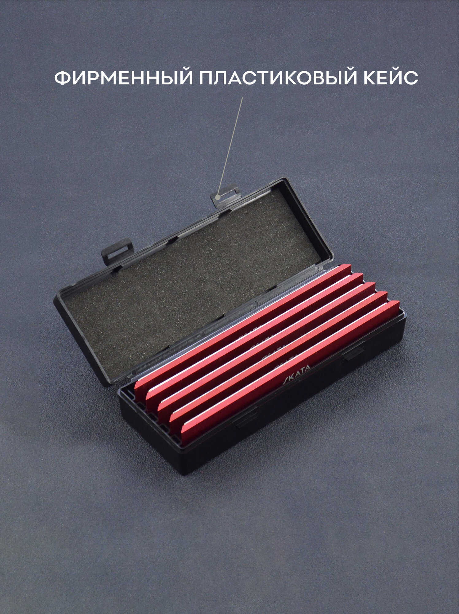 Набор алмазных пластин на алюминиевых бланках красного цвета в фирменном пластиковом кейсе.
