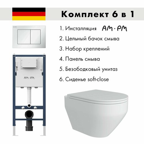Комплект AM.PM I012709.0201 PrimeFit инсталляция для унитаза с клавишей PrimeFit S, бел глянц + Alentori FLUIRE 208 Унитаз безободковый, быстросъёмное сиденье с микролифтом, белый глян.