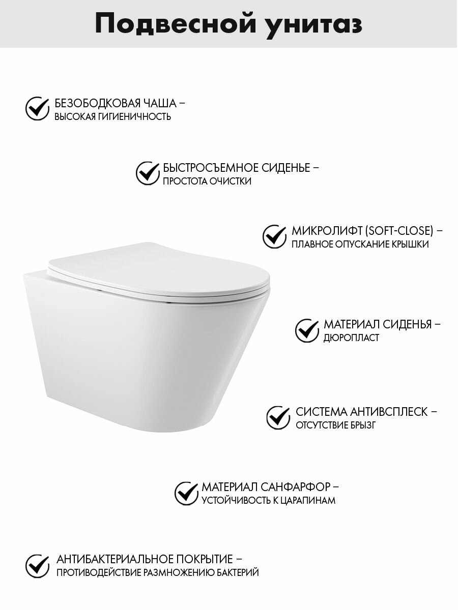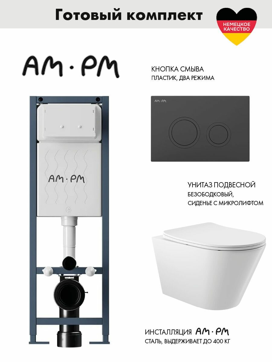 Комплект AM.PM I012711.0138 ErgoFit инсталляция для унитаза с клавишей ErgoFit L пластик, черный матовый + Унитаз 525*360 безободковый, сиденье Soft-Close, белый глянцевый, конус