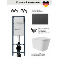 Комплект AM.PM I012711.0138 ErgoFit инсталляция для унитаза с клавишей ErgoFit L пластик, черный матовый + Унитаз Long 520*370 безободковый, Vortex, сиденье Soft-Close, белый глянцевый, квадрат