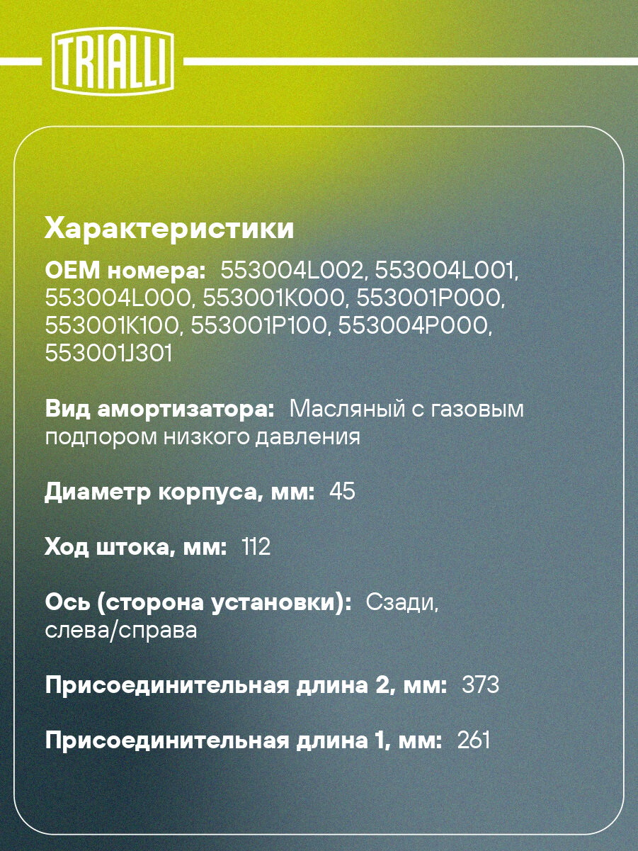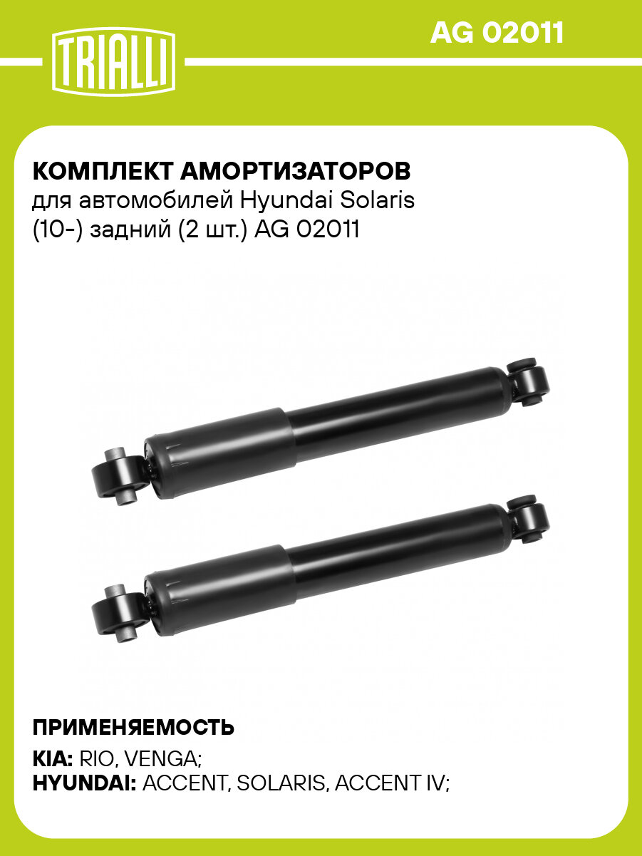 Комплект амортизаторов для автомобилей Hyundai Solaris (10-) задний (2 шт.) AG 02011 TRIALLI: сравнение цен, характеристики, фото, актуальное наличие и цены.