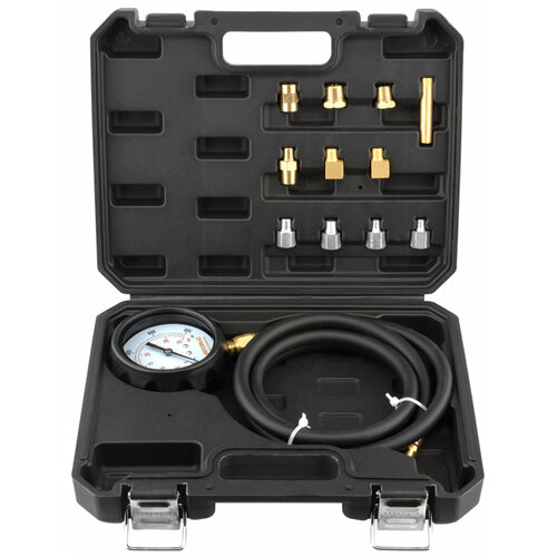 Измеритель давления масла 0-35.0 Bar 40080. Применяется для измерения давления масла в двигателях внутреннего сгорания и в автоматических коробках передач. Состоит из большого манометра с легко читаемой шкалой, резинового шланга и набора резьбовых адаптеров. Присоединительные резьбы адаптеров соответствуют размерам резьбы датчиков давления масла, большинства современных легковых автомобилей. Максимальное измеряемое давление – 35 кгс/см. Размер присоединительных адаптеров: Латунные - 3/8; х18 NPT (внешняя резьба), 1/8; х27 NPT изогнутый 90 (внешняя резьба), 1/8; х27 NPT (внутренняя резьба), 1/8; х28 BSPT изогнутый 90 (внешняя резьба), M8х1,0 (внешняя); Алюминиевые адаптеры - 1/4; х18 NPT (внутренняя), M10х1,0 (внешняя), M12х1,5 (внешняя резьба), M14х1,5 (внешняя резьба). Поставляется в индивидуальном пластиковом кейсе.