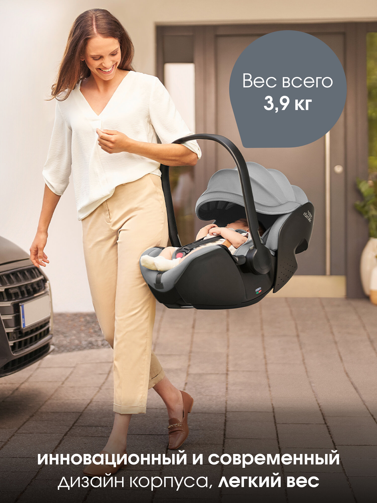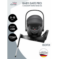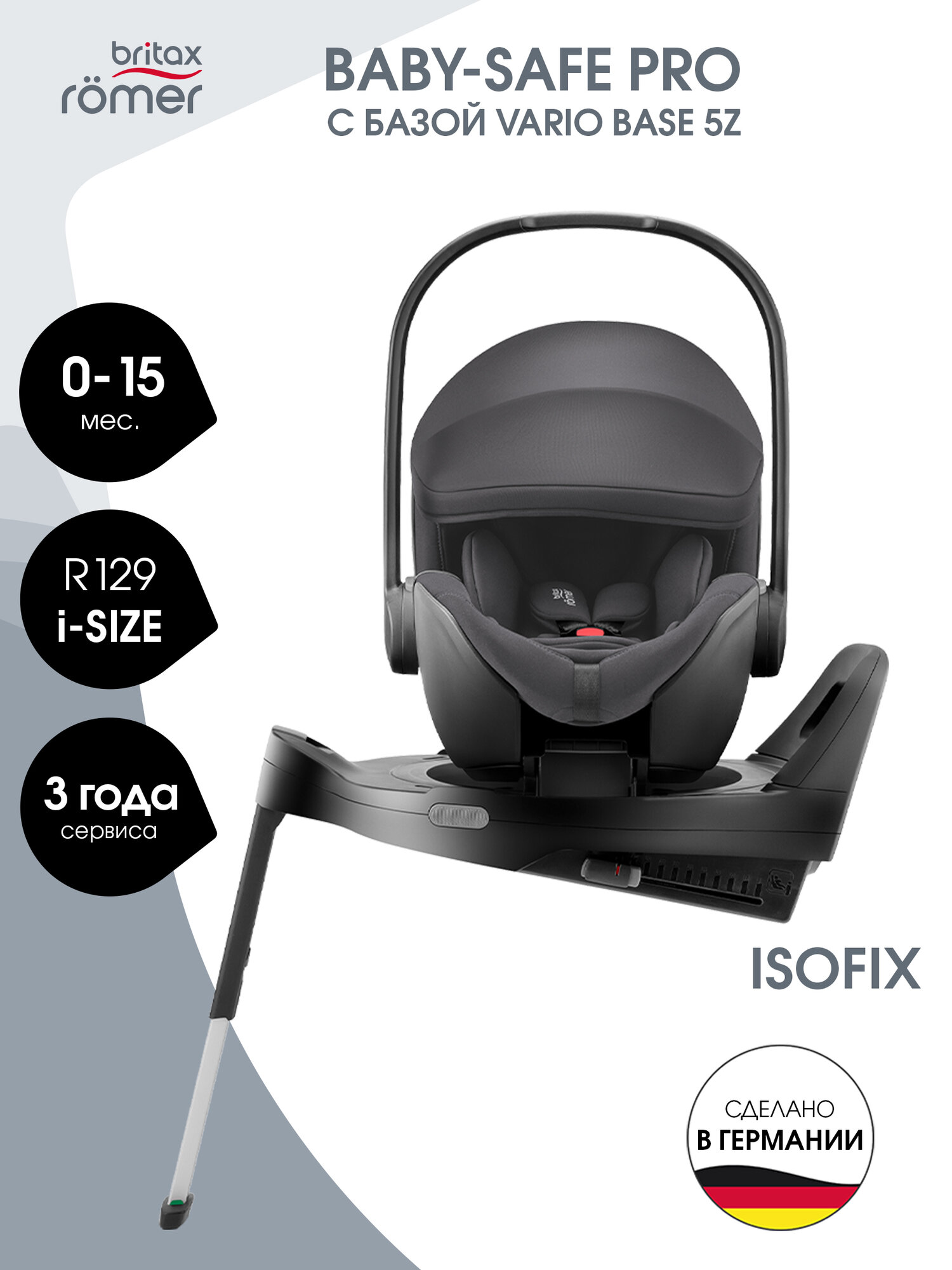 Комплект 2 в 1: автокресло BABY-SAFE PRO + поворотная база VARIO BASE 5Z с системой ISOFIX и опорной ногой. Для детей ростом 40 – 85 см (с рождения до ≈ 15 месяцев | 13 кг) BABY-SAFE PRO – инновационная, простая в использовании и самая лёгкая автолюлька для новорожденных от немецкого бренда Britax Roemer. Люлька оснащена функцией наклона спинки Ergo Recline, которая обеспечивает более ровное, естественное и при этом максимально безопасное положение малыша. Быстро и всего одним щелчком устанавливается на базу VARIO BASE 5Z*, входящую в комплект. При необходимости может крепиться только штатным ремнем (если в авто нет ISOFIX). Автолюлька совместима с большинством прогулочных колясок. Основные характеристики: Подходит для новорожденных и детей до 15 месяцев. При установке на базу функция вращения позволяет поворачивать автокресло на 90° к двери автомобиля, что упрощает посадку и пристёгивание ребёнка. Соответствует передовому европейскому стандарту безопасности R129 i-SIZE. Технология Ergo Recline. Теперь вы сами можете регулировать наклон спинки автолюльки. Полулежачее положение способствует здоровому развитию позвоночника и гарантирует, что дыхание младенца будет свободным, а не сжатым. Функцию Ergo Recline можно использовать в автомобиле на базе и со штатным ремнем безопасности, а также на коляске. Автолюлька разрешена для использования в самолете. Крепится с помощью базы с индивидуально регулируемыми креплениями ISOFIX или с помощью штатного ремня автомобиля. Устанавливается против хода движения. Благодаря звуковому щелчку вы всегда можете быть уверены, что база установлена без ошибок. Кроме того, индикатор на базе обеспечивает дополнительную уверенность в правильной установке. Защита от боковых ударов. Специально разработанная конструкция поглощает силу бокового удара, обеспечивая максимальную безопасность ребенка. В комплект входит вкладыш для новорожденных анатомической формы с поглощающими удар вставками для большей защиты и комфорта малыша. Регулируемая ручка имеет несколько положений, чтобы было удобно сажать и переносить ребенка в автолюльке. Нажмите кнопки на каждой стороне ручки, чтобы разблокировать и переместить ее. Благодаря полукруглому основанию удобно укачивать малыша на ровной поверхности, в качестве ограничителя качания можно использовать регулируемую ручку люльки-переноски, опустив ее вниз до упора. Автокресло растет вместе с ребенком: мягкий подголовник с эффектом памяти (memory foam) легко регулируется одной рукой под рост малыша (около каждого положения указан рост ребенка, вы точно не ошибетесь). 3-точечные ремни безопасности удобно и безопасно фиксируют ребенка в автолюльке. Их можно отрегулировать в 3 положениях по мере роста малыша. Очень большой регулируемый солнцезащитный козырек с УФ 50+ защитит ребёнка от солнца и ветра. Комфорт в любое время года. Благодаря наличию вентиляционных отверстий в корпусе и мягких гипоаллергенных тканей чехла. Чехол и козырек съемные, можно стирать при 30 градусах. Обеспечьте своему ребенку дополнительную защиту на случай аварии: бампер базы VARIO BASE 5Z помогает предотвратить опрокидывание автокресла при столкновении. А регулируемая по высоте опорная нога фиксируется в пол автомобиля и обеспечивает устойчивость, сводя к минимуму перекос автокресла. За счёт специального индикатора легко понять, когда опора плотно прижа