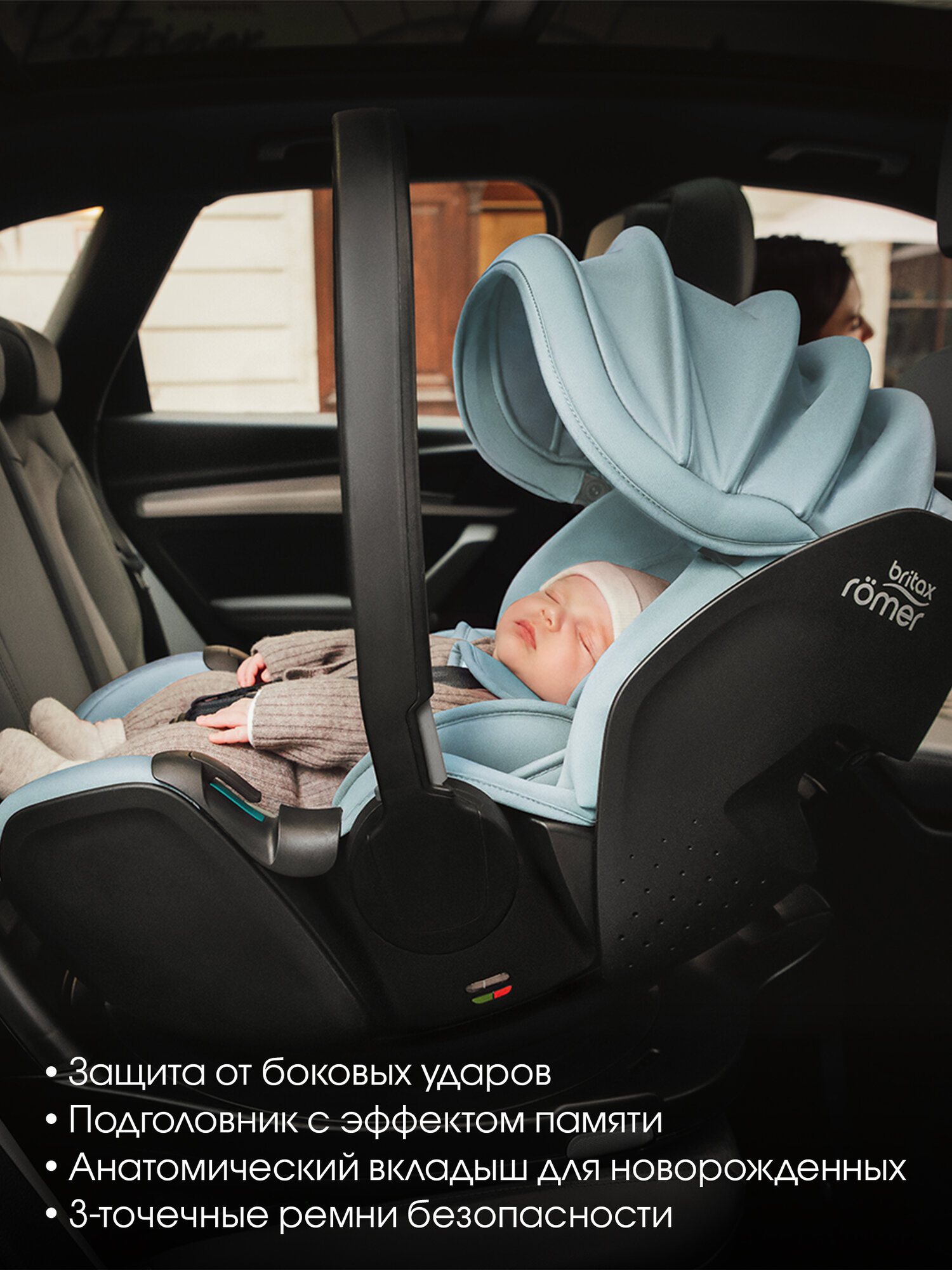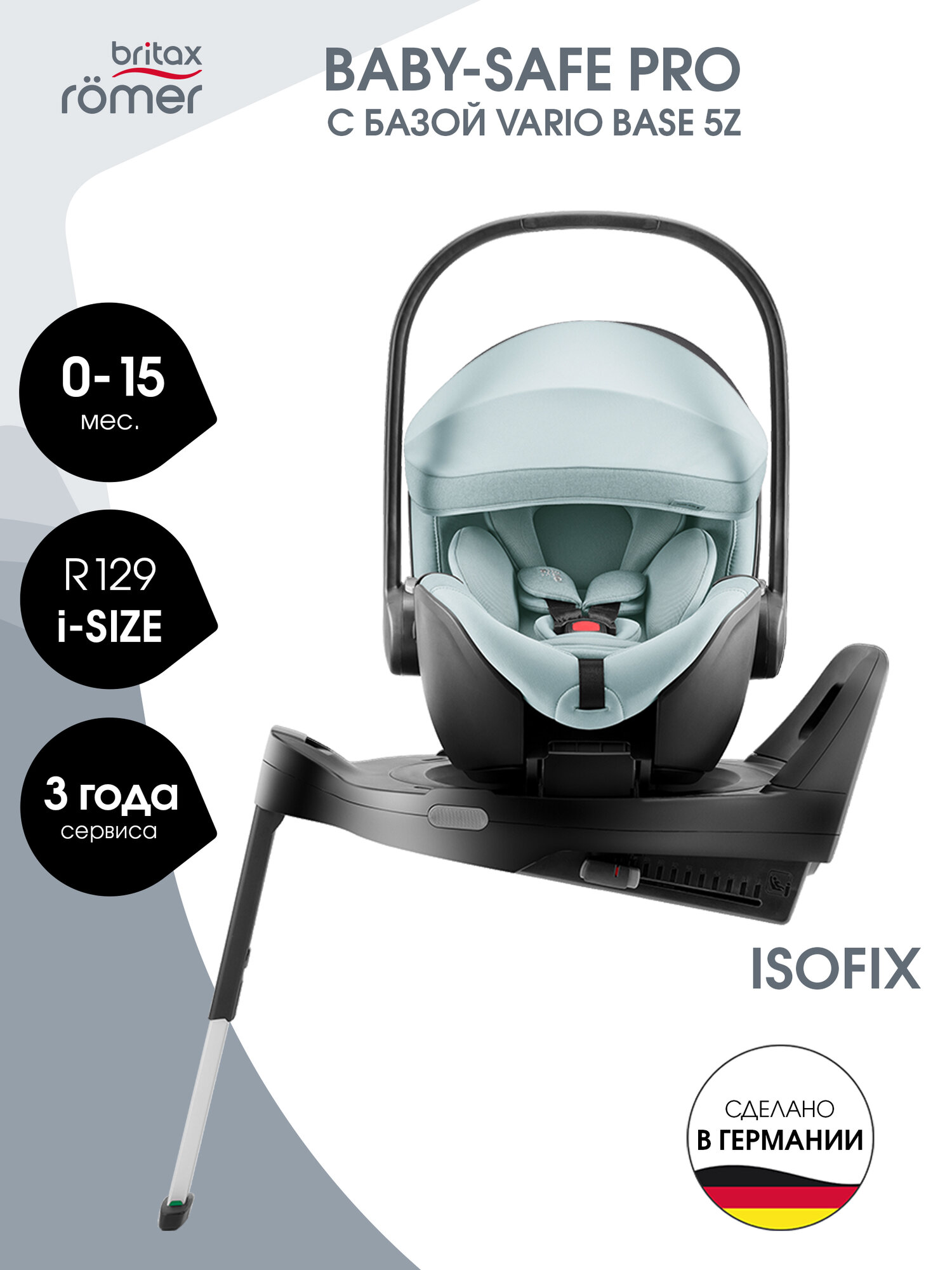 Комплект 2 в 1: автокресло BABY-SAFE PRO + поворотная база VARIO BASE 5Z с системой ISOFIX и опорной ногой. Для детей ростом 40 – 85 см (с рождения до ≈ 15 месяцев | 13 кг) BABY-SAFE PRO – инновационная, простая в использовании и самая лёгкая автолюлька для новорожденных от немецкого бренда Britax Roemer. Люлька оснащена функцией наклона спинки Ergo Recline, которая обеспечивает более ровное, естественное и при этом максимально безопасное положение малыша. Быстро и всего одним щелчком устанавливается на базу VARIO BASE 5Z*, входящую в комплект. При необходимости может крепиться только штатным ремнем (если в авто нет ISOFIX). Автолюлька совместима с большинством прогулочных колясок. Основные характеристики: Подходит для новорожденных и детей до 15 месяцев. При установке на базу функция вращения позволяет поворачивать автокресло на 90° к двери автомобиля, что упрощает посадку и пристёгивание ребёнка. Соответствует передовому европейскому стандарту безопасности R129 i-SIZE. Технология Ergo Recline. Теперь вы сами можете регулировать наклон спинки автолюльки. Полулежачее положение способствует здоровому развитию позвоночника и гарантирует, что дыхание младенца будет свободным, а не сжатым. Функцию Ergo Recline можно использовать в автомобиле на базе и со штатным ремнем безопасности, а также на коляске. Автолюлька разрешена для использования в самолете. Крепится с помощью базы с индивидуально регулируемыми креплениями ISOFIX или с помощью штатного ремня автомобиля. Устанавливается против хода движения. Благодаря звуковому щелчку вы всегда можете быть уверены, что база установлена без ошибок. Кроме того, индикатор на базе обеспечивает дополнительную уверенность в правильной установке. Защита от боковых ударов. Специально разработанная конструкция поглощает силу бокового удара, обеспечивая максимальную безопасность ребенка. В комплект входит вкладыш для новорожденных. Он выполнен из сетчатой "дышащей" ткани и имеет анатомическую форму с поглощающими удар вставками для большей защиты и комфорта малыша. Регулируемая ручка имеет несколько положений, чтобы было удобно сажать и переносить ребенка в автолюльке. Нажмите кнопки на каждой стороне ручки, чтобы разблокировать и переместить ее. Благодаря полукруглому основанию удобно укачивать малыша на ровной поверхности, в качестве ограничителя качания можно использовать регулируемую ручку люльки-переноски, опустив ее вниз до упора. Автокресло растет вместе с ребенком: мягкий подголовник с эффектом памяти (memory foam) легко регулируется одной рукой под рост малыша (около каждого положения указан рост ребенка, вы точно не ошибетесь). 3-точечные ремни безопасности удобно и безопасно фиксируют ребенка в автолюльке. Их можно отрегулировать в 3 положениях по мере роста малыша. Очень большой регулируемый солнцезащитный козырек с УФ 50+ защитит ребёнка от солнца и ветра. Комфорт в любое время года. Благодаря наличию вентиляционных отверстий в корпусе и мягких гипоаллергенных тканей чехла. Чехол и козырек съемные, можно стирать при 30 градусах. Обеспечьте своему ребенку дополнительную защиту на случай аварии: бампер базы VARIO BASE 5Z помогает предотвратить опрокидывание автокресла при столкновении. А регулируемая по высоте опорная нога фиксируется в пол автомобиля и обеспечивает устойчивость, сводя к минимуму перекос автокресла. За счёт специального ин