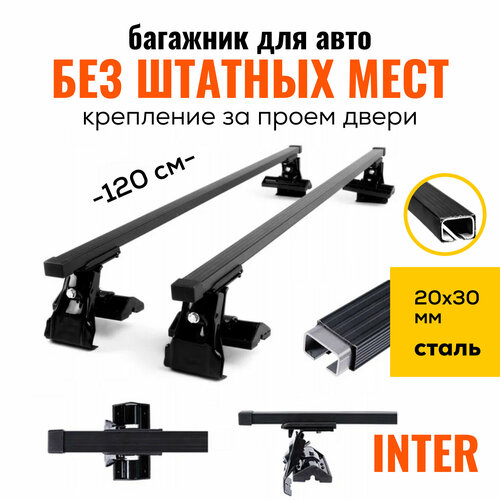 Комплект багажника Inter D1-120 20х30 для автомобилей с гладкой крышей с креплением за проем двери, универсальный (4 упора черные + 2 перекладины 120 см, прямоугольного 20х30 сечения в черном цвете)