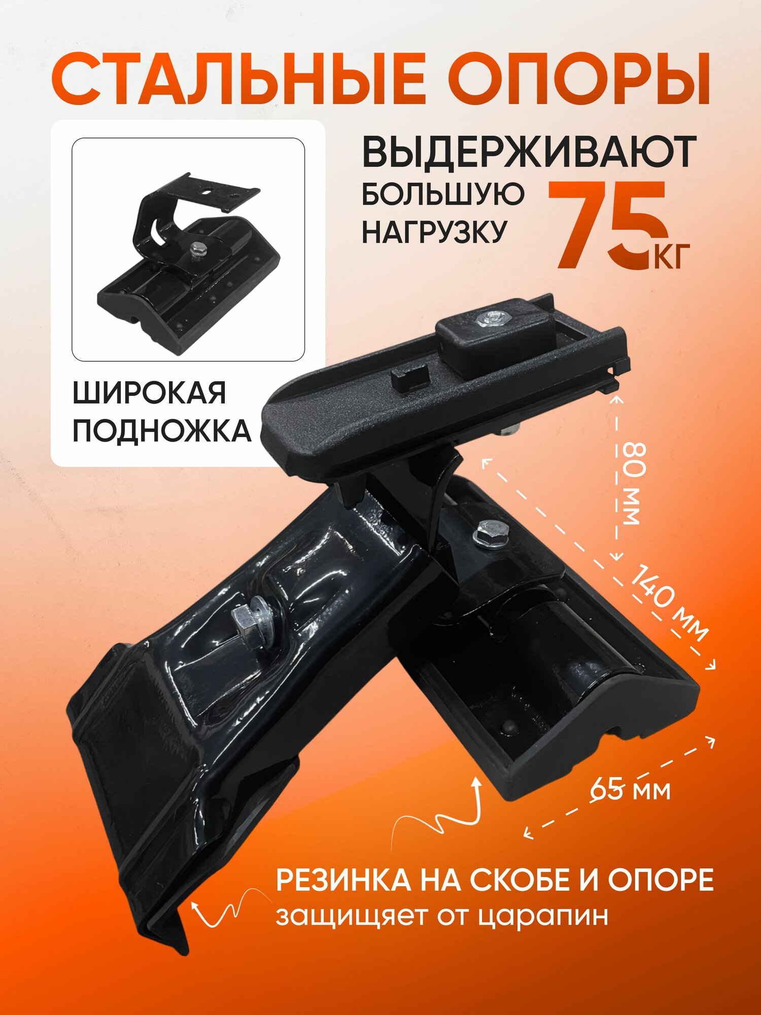 - Данная багажная система для автомобилей с гладкой крышей состоит из опор, которые упираются в саму крышу, адаптеров, которые прижимают опоры к крыше и крепятся за дверной проем автомобиля, а так же двух поперечных металлических дуг прямоугольного сечения 20х30, в пластике черного цвета.