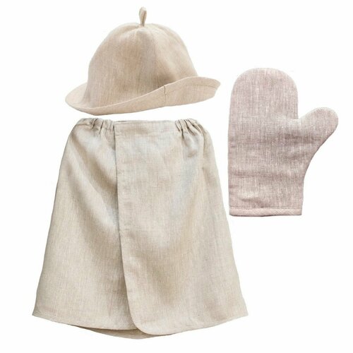 Шапка изготовлена из мягкого льна, который отлично впитывает влагу, обеспечивая защиту волос от воздействия высоких температур в парной. Рукавица и килт также выполнены из льна с добавлением хлопка, что делает их прочными, долговечными и приятными на ощупь.