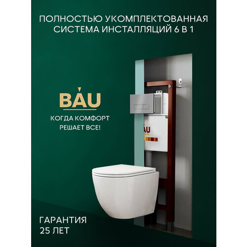 Универсальная инсталляция с унитазом подходит для различных стилей интерьера. Она снабжена скрытым подводом воды, что создает аккуратный вид без лишних труб и приспособлений. Две кнопки позволяют выбрать режим смыва: полный или экономичный, что особенно важно для квартиры или дома. Объем смывного бачка: 3 и 6 л. К комплекту относится белый безободковый унитаз, выполненный из санфарфора. Функция антивсплеск предотвращает разбрызгивание воды при использовании, обеспечивая чистоту и гигиеничность. Сиденье с функцией микролифта позволяет плавно закрывать его. Быстросъемное сиденье делает уборку удобной и легкой. Металлическая рама инсталляции обеспечивает надежную поддержку конструкции. Она выдерживает вес до четырехсот килограммов, что гарантирует долгий срок службы устройства даже при интенсивной эксплуатации. Инсталляция предназначена для подвесного унитаза и совместима с унитазами всех брендов и размеров, таких как Grohe, Weltwasser, Lavinia Boho, Ceramicanova, Ceruttispa, AM.PM, Aquatek. Монтаж системы удобен благодаря продуманному дизайну. В инсталляции ВАU подвод воды сверху, что значительно упрощает установку и последующее обслуживание. Механическая клавиша управления надежна, функциональна и проста в использовании. Набор BAU 6 в 1 станет отличным решением как для новой квартиры, так и для ремонта существующего помещения ванной комнаты. Удобство эксплуатации, стильный дизайн и высокие технологические характеристики делают данную инсталляцию идеальным выбором для современного дома. Инсталляция с подвесным унитазом это надежное минималистичное и практичное решение для тех, кто ценит комфорт и порядок в ванной комнате. Если вы хотите купить унитаз с максимальной функциональностью по разумной цене, этот вариант станет удачным выбором без компромиссов по качеству или внешнему виду. Вы останетесь довольны качеством материалов и простотой ухода за изделиями данного комплекта.