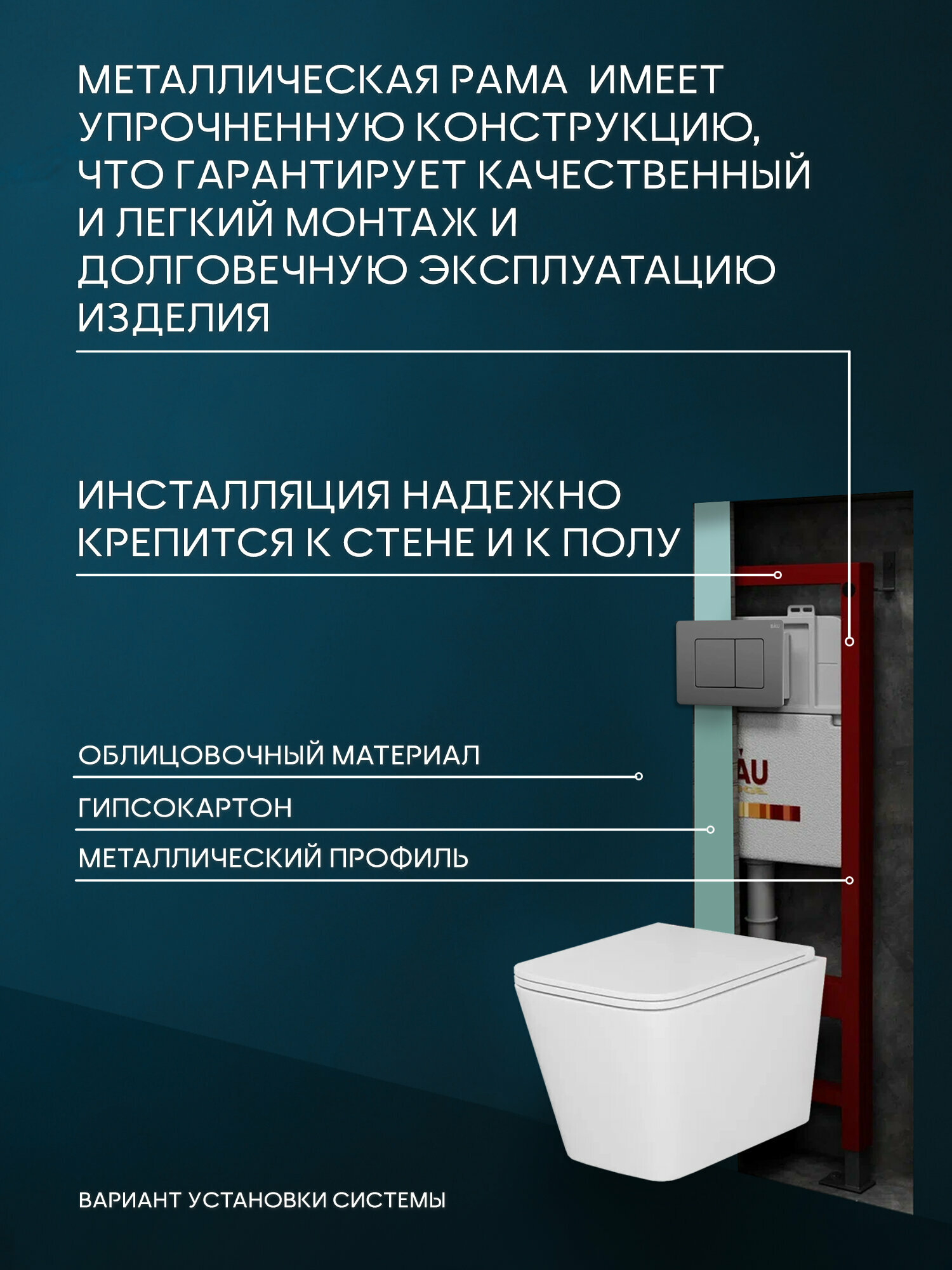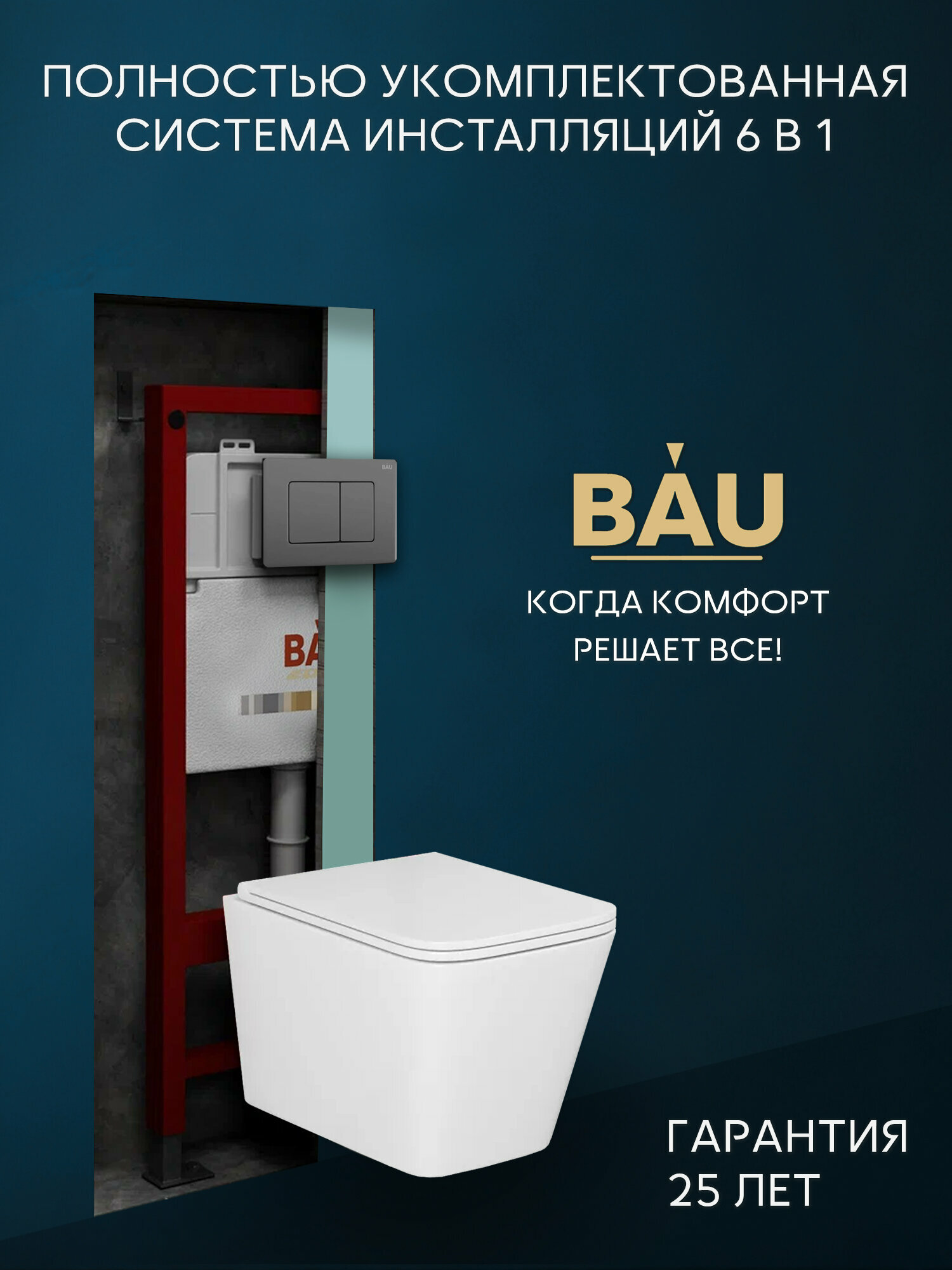 Купить Комплект BAU 6 в 1: инсталляция BAU PRO, унитаз подвесной безободковый вихревой Bau Stil Hurricane, быстросъемное тонкое сиденье дюропласт микролифт, клавиша Stil Gun Grey, темно-серый металлик с доставкой по всей России.