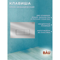 Комплект BAU 6 в 1: инсталляция BAU PRO, унитаз подвесной торнадо Bau Dream Hurricane-2, сиденье дюропласт микролифт, клавиша BAU Hotel, хром Рамная инсталляция BAU PRO для подвесного унитаза. Компактная модель - ширина рамы 52,5 см. Рама защищена полимерным порошковым покрытием, блокирующим появление коррозии. Прочная металлическая рама инсталляционной системы позволяет выдерживать вес до 400 кг, что подтверждено техническими испытаниями. Крепится в капитальную стену и пол. Экономный слив предполагает две кнопки смыва – для полного и частичного слива бачка. Объем смывного бачка: 3 и 6 л. Подвод воды сверху. Диаметр слива: 10 см. Монтажная высота: 115,5 см. Гарантия на инсталляцию 10 лет. Подходит для всех унитазов брендов Bau, Grohe, Roca, Cersanit, OWL, Azario, Lavinia Boho, Teymi Комплектация: Цельнодутый резервуар для воды HDPE; ABS/POM/PP/PE; резина/NBR. Рама: NW. 8,05 кг/30*50*1,5 мм. /порошковая покраска Латунный клапан 1/2" Крепежные винты к стене Сливная труба Выходная труба 110мм Уплотнительные резиновые кольца Прокладка под плитку Монтажный набор со шпильками для подвесного унитаза Пластиковый короб для защиты при отделке Унитаз подвесной безободковый торнадо обратного потока Bau Dream 52х36 Hurricane-2, быстросъемное тонкое сиденье дюропласт микролифт. Совершенно новая система вихревая смыва: Торнадо обратного потока. Обеспечивает лучший по сравнению я обычным безободковым унитазом смыв, уровень шумности сри сливе снижен в 3 раза. Подходит для инсталляций Bauedge, Geberit, Cersanit, Berges, Oli, Grohe, Roca, Alcaplast, Delice, Tece, Grossman, Point и других. Форма: овальная. Безободковый. Материал сиденья: дюропласт. Режим слива воды: Вихревой, режим смыва - Торнадо. Сиденье с микролифтом: есть, уже установлено. Материал: санфарфор. Плюсы санфарфора: высокие прочность и плотность, натуральный белый цвет, минимальное влагопоглощение, гигиеничность, долговечность. Состав сырья для санитарного фарфора почти не отличается от фаянса. Это все те же белые глины, кварцевый песок и каолин. Кроме них присутствует еще и полевой шпат. Но вот пропорции, в которых добавляются компоненты, отличаются. Различается и технология производства материала. Формованные заготовки запекают при температуре 750-800˚С. При таком нагреве выжигаются все органические примеси, что дает фарфоровой массе однородный белоснежный цвет. На следующем этапе заготовки покрывают глазуровочной смесью. Однако ее состав тоже другой. Она не содержит пигментов, поскольку фарфор не надо окрашивать. Подготовленное таким образом изделие отправляется в печь, где обжигается в течение часа-полутора при температуре 1250˚С. После остывания материал приобретает высокую прочность и все заявленные эксплуатационные характеристики. Кнопка смыва BAU Hotel для инсталляции, хром. Стильная механическая клавиша для инсталляции - небольшая деталь, которая всегда будет на виду. Клавиша изготовлена из пластика и имеет серебристый цвет. Прямоугольные кнопки будут сочетаться со спокойным, гармоничным интерьером. Клавиша оснащена двумя режимами смыва: 3л и 6л. Клавиши: прямоугольные. Материал: пластик. Цвет: хром. Назначение: для унитазов.