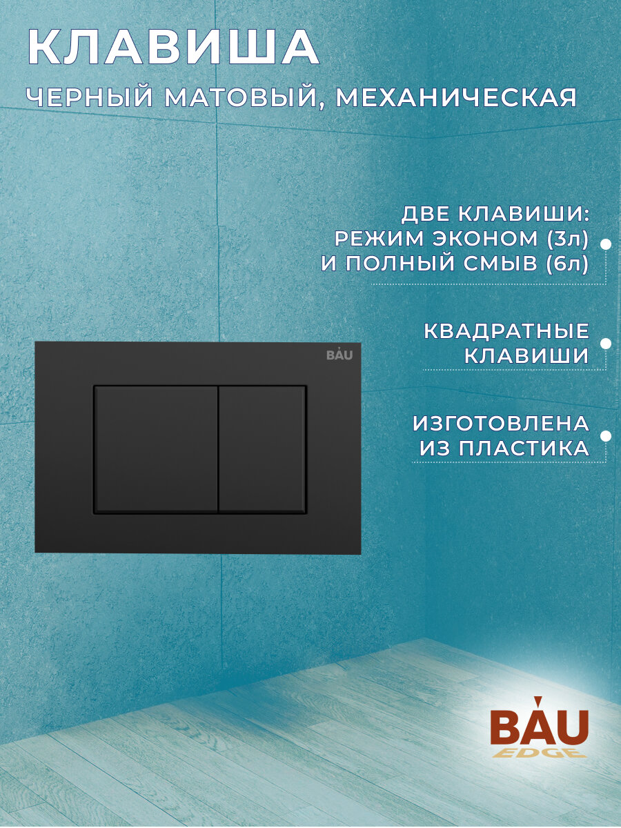 Комплект BAU 6 в 1: инсталляция BAU PRO, унитаз подвесной торнадо Bau Dream Hurricane-2, сиденье дюропласт микролифт, клавиша BAU Stil, черный матовый Рамная инсталляция BAU PRO для подвесного унитаза. Компактная модель - ширина рамы 52,5 см. Рама защищена полимерным порошковым покрытием, блокирующим появление коррозии. Прочная металлическая рама инсталляционной системы позволяет выдерживать вес до 400 кг, что подтверждено техническими испытаниями. Крепится в капитальную стену и пол. Экономный слив предполагает две кнопки смыва – для полного и частичного слива бачка. Объем смывного бачка: 3 и 6 л. Подвод воды сверху. Диаметр слива: 10 см. Монтажная высота: 115,5 см. Гарантия на инсталляцию 10 лет. Подходит для всех унитазов брендов Bau, Grohe, Roca, Cersanit, OWL, Azario, Lavinia Boho, Teymi Комплектация: Цельнодутый резервуар для воды HDPE; ABS/POM/PP/PE; резина/NBR. Рама: NW. 8,05 кг/30*50*1,5 мм. /порошковая покраска Латунный клапан 1/2" Крепежные винты к стене Сливная труба Выходная труба 110мм Уплотнительные резиновые кольца Прокладка под плитку Монтажный набор со шпильками для подвесного унитаза Пластиковый короб для защиты при отделке Унитаз подвесной безободковый торнадо обратного потока Bau Dream 52х36 Hurricane-2, быстросъемное тонкое сиденье дюропласт микролифт. Совершенно новая система вихревая смыва: Торнадо обратного потока. Обеспечивает лучший по сравнению я обычным безободковым унитазом смыв, уровень шумности сри сливе снижен в 3 раза. Подходит для инсталляций Bauedge, Geberit, Cersanit, Berges, Oli, Grohe, Roca, Alcaplast, Delice, Tece, Grossman, Point и других. Форма: овальная. Безободковый. Материал сиденья: дюропласт. Режим слива воды: Вихревой, режим смыва - Торнадо. Сиденье с микролифтом: есть, уже установлено. Материал: санфарфор. Плюсы санфарфора: высокие прочность и плотность, натуральный белый цвет, минимальное влагопоглощение, гигиеничность, долговечность. Состав сырья для санитарного фарфора почти не отличается от фаянса. Это все те же белые глины, кварцевый песок и каолин. Кроме них присутствует еще и полевой шпат. Но вот пропорции, в которых добавляются компоненты, отличаются. Различается и технология производства материала. Формованные заготовки запекают при температуре 750-800˚С. При таком нагреве выжигаются все органические примеси, что дает фарфоровой массе однородный белоснежный цвет. На следующем этапе заготовки покрывают глазуровочной смесью. Однако ее состав тоже другой. Она не содержит пигментов, поскольку фарфор не надо окрашивать. Подготовленное таким образом изделие отправляется в печь, где обжигается в течение часа-полутора при температуре 1250˚С. После остывания материал приобретает высокую прочность и все заявленные эксплуатационные характеристики. Кнопка смыва BAU Stil для инсталляциии, черный матовый. Стильная механическая клавиша для инсталляции - небольшая деталь, которая всегда будет на виду. Клавиша изготовлена из пластика и имеет черный матовый цвет. Квадратные кнопки будут сочетаться со спокойным, гармоничным интерьером. Клавиша оснащена двумя режимами смыва: 3л и 6л. Клавиши: квадратные. Материал: пластик. Цвет: черный матовый. Назначение: для унитазов.