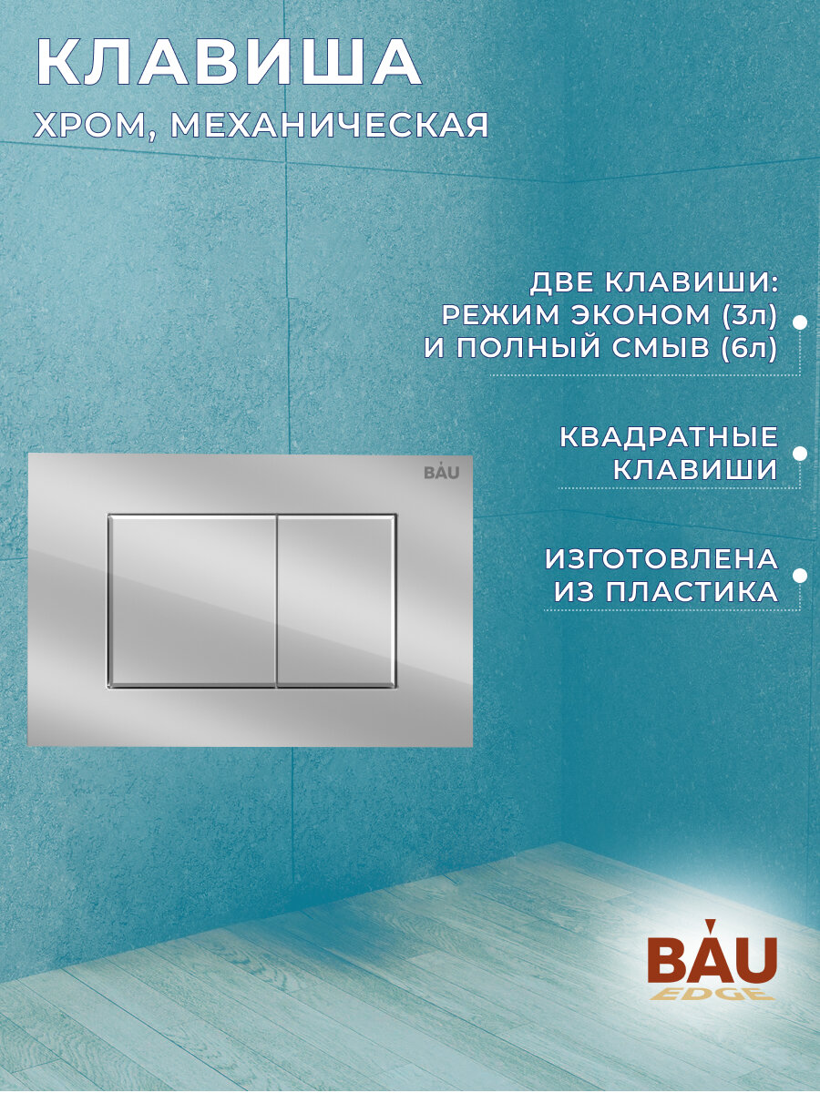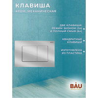 Комплект BAU 6 в 1: инсталляция BAU PRO, унитаз подвесной торнадо Bau Dream Hurricane-2, сиденье дюропласт микролифт, клавиша BAU Stil, хром Рамная инсталляция BAU PRO для подвесного унитаза. Компактная модель - ширина рамы 52,5 см. Рама защищена полимерным порошковым покрытием, блокирующим появление коррозии. Прочная металлическая рама инсталляционной системы позволяет выдерживать вес до 400 кг, что подтверждено техническими испытаниями. Крепится в капитальную стену и пол. Экономный слив предполагает две кнопки смыва – для полного и частичного слива бачка. Объем смывного бачка: 3 и 6 л. Подвод воды сверху. Диаметр слива: 10 см. Монтажная высота: 115,5 см. Гарантия на инсталляцию 10 лет. Подходит для всех унитазов брендов Bau, Grohe, Roca, Cersanit, OWL, Azario, Lavinia Boho, Teymi Комплектация: Цельнодутый резервуар для воды HDPE; ABS/POM/PP/PE; резина/NBR. Рама: NW. 8,05 кг/30*50*1,5 мм. /порошковая покраска Латунный клапан 1/2" Крепежные винты к стене Сливная труба Выходная труба 110мм Уплотнительные резиновые кольца Прокладка под плитку Монтажный набор со шпильками для подвесного унитаза Пластиковый короб для защиты при отделке Унитаз подвесной безободковый торнадо обратного потока Bau Dream 52х36 Hurricane-2, быстросъемное тонкое сиденье дюропласт микролифт. Совершенно новая система вихревая смыва: Торнадо обратного потока. Обеспечивает лучший по сравнению я обычным безободковым унитазом смыв, уровень шумности сри сливе снижен в 3 раза. Подходит для инсталляций Bauedge, Geberit, Cersanit, Berges, Oli, Grohe, Roca, Alcaplast, Delice, Tece, Grossman, Point и других. Форма: овальная. Безободковый. Материал сиденья: дюропласт. Режим слива воды: Вихревой, режим смыва - Торнадо. Сиденье с микролифтом: есть, уже установлено. Материал: санфарфор. Плюсы санфарфора: высокие прочность и плотность, натуральный белый цвет, минимальное влагопоглощение, гигиеничность, долговечность. Состав сырья для санитарного фарфора почти не отличается от фаянса. Это все те же белые глины, кварцевый песок и каолин. Кроме них присутствует еще и полевой шпат. Но вот пропорции, в которых добавляются компоненты, отличаются. Различается и технология производства материала. Формованные заготовки запекают при температуре 750-800˚С. При таком нагреве выжигаются все органические примеси, что дает фарфоровой массе однородный белоснежный цвет. На следующем этапе заготовки покрывают глазуровочной смесью. Однако ее состав тоже другой. Она не содержит пигментов, поскольку фарфор не надо окрашивать. Подготовленное таким образом изделие отправляется в печь, где обжигается в течение часа-полутора при температуре 1250˚С. После остывания материал приобретает высокую прочность и все заявленные эксплуатационные характеристики. Кнопка смыва BAU Stil для инсталляциии, хром. Стильная механическая клавиша для инсталляции - небольшая деталь, которая всегда будет на виду. Клавиша изготовлена из пластика и имеет глянцевый серебристый цвет. Квадратные кнопки будут сочетаться со спокойным, гармоничным интерьером. Клавиша оснащена двумя режимами смыва: 3л и 6л. Клавиши: квадратные. Материал: пластик. Цвет: хром. Назначение: для унитазов.