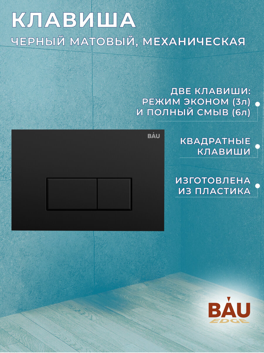 Комплект BAU 6 в 1: инсталляция BAU PRO, унитаз подвесной торнадо Bau Dream Hurricane-2, сиденье дюропласт микролифт, клавиша Hotel, черный матовый Рамная инсталляция BAU PRO для подвесного унитаза. Компактная модель - ширина рамы 52,5 см. Рама защищена полимерным порошковым покрытием, блокирующим появление коррозии. Прочная металлическая рама инсталляционной системы позволяет выдерживать вес до 400 кг, что подтверждено техническими испытаниями. Крепится в капитальную стену и пол. Экономный слив предполагает две кнопки смыва – для полного и частичного слива бачка. Объем смывного бачка: 3 и 6 л. Подвод воды сверху. Диаметр слива: 10 см. Монтажная высота: 115,5 см. Гарантия на инсталляцию 10 лет. Подходит для всех унитазов брендов Bau, Grohe, Roca, Cersanit, OWL, Azario, Lavinia Boho, Teymi Комплектация: Цельнодутый резервуар для воды HDPE; ABS/POM/PP/PE; резина/NBR. Рама: NW. 8,05 кг/30*50*1,5 мм. /порошковая покраска Латунный клапан 1/2" Крепежные винты к стене Сливная труба Выходная труба 110мм Уплотнительные резиновые кольца Прокладка под плитку Монтажный набор со шпильками для подвесного унитаза Пластиковый короб для защиты при отделке Унитаз подвесной безободковый торнадо обратного потока Bau Dream 52х36 Hurricane-2, быстросъемное тонкое сиденье дюропласт микролифт. Совершенно новая система вихревая смыва: Торнадо обратного потока. Обеспечивает лучший по сравнению я обычным безободковым унитазом смыв, уровень шумности сри сливе снижен в 3 раза. Подходит для инсталляций Bauedge, Geberit, Cersanit, Berges, Oli, Grohe, Roca, Alcaplast, Delice, Tece, Grossman, Point и других. Форма: овальная. Безободковый. Материал сиденья: дюропласт. Режим слива воды: Вихревой, режим смыва - Торнадо. Сиденье с микролифтом: есть, уже установлено. Материал: санфарфор. Плюсы санфарфора: высокие прочность и плотность, натуральный белый цвет, минимальное влагопоглощение, гигиеничность, долговечность. Состав сырья для санитарного фарфора почти не отличается от фаянса. Это все те же белые глины, кварцевый песок и каолин. Кроме них присутствует еще и полевой шпат. Но вот пропорции, в которых добавляются компоненты, отличаются. Различается и технология производства материала. Формованные заготовки запекают при температуре 750-800˚С. При таком нагреве выжигаются все органические примеси, что дает фарфоровой массе однородный белоснежный цвет. На следующем этапе заготовки покрывают глазуровочной смесью. Однако ее состав тоже другой. Она не содержит пигментов, поскольку фарфор не надо окрашивать. Подготовленное таким образом изделие отправляется в печь, где обжигается в течение часа-полутора при температуре 1250˚С. После остывания материал приобретает высокую прочность и все заявленные эксплуатационные характеристики. Кнопка смыва BAU Hotel для инсталляции, черный матовый. Стильная механическая клавиша для инсталляции - небольшая деталь, которая всегда будет на виду. Клавиша изготовлена из пластика и имеет черный матовый цвет. Прямоугольные кнопки будут сочетаться со спокойным, гармоничным интерьером. Клавиша оснащена двумя режимами смыва: 3л и 6л. Клавиши: прямоугольные. Материал: пластик. Цвет: черный матовый. Назначение: для унитазов.