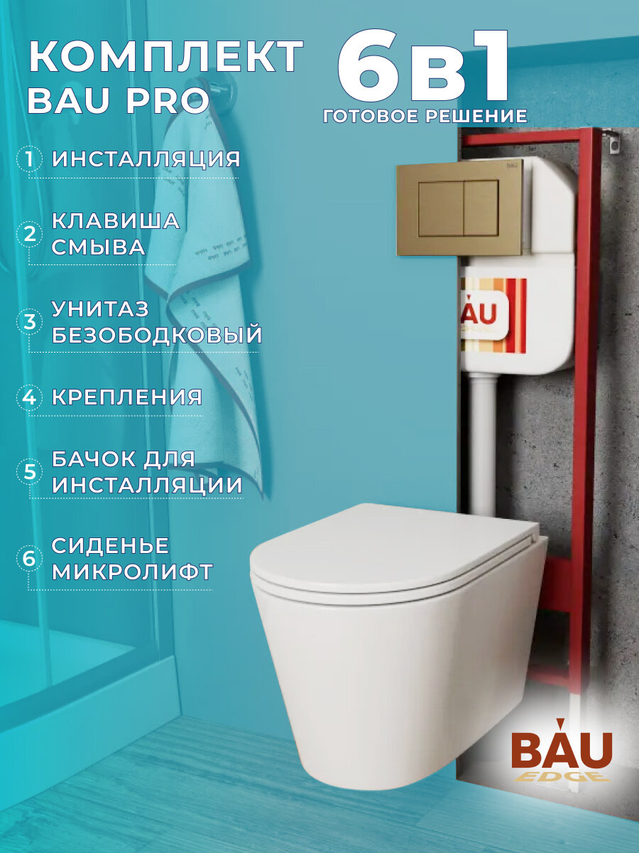 Комплект BAU 6 в 1: рамная инсталляция BAU NEO 45, унитаз подвесной безободковый торнадо обратного потока Bau Nimb Hurricane-2, быстросъемное сиденье дюропласт микролифт, клавиша BAU Stil, бронза. Рамная инсталляция BAU NEO 45 для подвесного унитаза. Компактная модель - ширина рамы 45 см. Рама защищена полимерным порошковым покрытием, блокирующим появление коррозии. Прочная металлическая рама инсталляционной системы позволяет выдерживать вес до 400 кг, что подтверждено техническими испытаниями. Крепится в капитальную стену и пол. Экономный слив предполагает две кнопки смыва – для полного и частичного слива бачка. Объем смывного бачка: 3 и 6 л. Подвод воды сверху. Диаметр слива: 10 см. Монтажная высота: 113 см. Гарантия на инсталляцию 15 лет. Подходит для всех унитазов брендов Bau, Grohe, Roca, Cersanit, OWL, Azario, Lavinia Boho, Teymi. Комплектация: Цельнодутый резервуар для воды HDPE; ABS/POM/PP/PE; резина/NBR. Рама: NW. 8,05 кг/30*50*1,5 мм. /порошковая покраска. Латунный клапан 1/2". Крепежные винты к стене. Сливная труба. Выходная труба 110мм. Уплотнительные резиновые кольца. Монтажный набор со шпильками для подвесного унитаза. Пластиковый короб для защиты при отделке. Унитаз подвесной безободковый торнадо обратного потока Bau Nimb Hurricane-2, быстросъемное тонкое сиденье дюропласт микролифт. Подходит для инсталляций Bauedge, Geberit, Grohe, Roca, Alcaplast, Cersanit, Oli, Delice, Tece, Grossman, Point и других. Форма: овальная скошенная. Безободковый. Материал сиденья: дюропласт. Система смыва вихревая "Торнадо обратного потока". Режим слива воды: определяется системой инсталляции. Сиденье с микролифтом: есть, уже установлено. Материал: санфарфор. Плюсы санфарфора: высокие прочность и плотность, натуральный белый цвет, минимальное влагопоглощение, гигиеничность, долговечность. Состав сырья для санитарного фарфора почти не отличается от фаянса. Это все те же белые глины, кварцевый песок и каолин. Кроме них присутствует еще и полевой шпат. Но вот пропорции, в которых добавляются компоненты, отличаются. Различается и технология производства материала. Формованные заготовки запекают при температуре 750-800˚С. При таком нагреве выжигаются все органические примеси, что дает фарфоровой массе однородный белоснежный цвет. На следующем этапе заготовки покрывают глазуровочной смесью. Однако ее состав тоже другой. Она не содержит пигментов, поскольку фарфор не надо окрашивать. Подготовленное таким образом изделие отправляется в печь, где обжигается в течение часа-полутора при температуре 1250˚С. После остывания материал приобретает высокую прочность и все заявленные эксплуатационные характеристики. Кнопка смыва BAU Stil для инсталляции, бронза. Стильная клавиша для инсталляции - небольшая деталь, которая всегда будет на виду. Клавиша изготовлена из пластика и имеет бронзовый цвет. Прямоугольные кнопки будут сочетаться со спокойным, гармоничным интерьером. Клавиша оснащена двумя режимами смыва: 3л и 6л. Клавиши: прямоугольные. Материал: пластик. Цвет: бронза. Назначение: для инсталляций NEO.