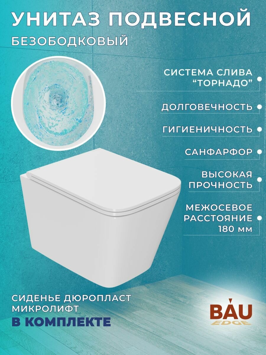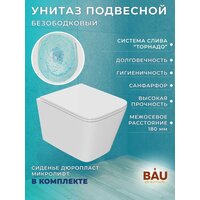 Комплект BAU 6 в 1: рамная инсталляция BAU NEO 45, унитаз подвесной безободковый торнадо обратного потока Bau Stil Hurricane-2, сиденье дюропласт микролифт, кнопка смыва BAU Stil , белый глянец. Рамная инсталляция BAU NEO 45 для подвесного унитаза. Компактная модель - ширина рамы 45 см. Рама защищена полимерным порошковым покрытием, блокирующим появление коррозии. Прочная металлическая рама инсталляционной системы позволяет выдерживать вес до 400 кг, что подтверждено техническими испытаниями. Крепится в капитальную стену и пол. Экономный слив предполагает две кнопки смыва – для полного и частичного слива бачка. Объем смывного бачка: 3 и 6 л. Подвод воды сверху. Диаметр слива: 10 см. Монтажная высота: 113 см. Гарантия на инсталляцию 15 лет. Подходит для всех унитазов брендов Bau, Grohe, Roca, Cersanit, OWL, Azario, Lavinia Boho, Teymi. Комплектация: Цельнодутый резервуар для воды HDPE; ABS/POM/PP/PE; резина/NBR. Рама: NW. 8,05 кг/30*50*1,5 мм. /порошковая покраска. Латунный клапан 1/2". Крепежные винты к стене. Сливная труба. Выходная труба 110мм. Уплотнительные резиновые кольца. Монтажный набор со шпильками для подвесного унитаза. Пластиковый короб для защиты при отделке. Унитаз подвесной безободковый торнадо обратного потока Bau Stil Hurricane-2, сиденье дюропласт микролифт. Подвесной унитаз – эффектный, современный, комфортный и практичный аксессуар, который и сохранит свободную площадь маленького туалета, и визуально облегчит пространство просторной уборной. Надежный и эргономичный унитаз - отличное предложение для бюджетных проектов. Прямоугольные< >формы и простые линии украсят любой интерьер. Лучший выбор по соотношению цены и качества. Самое большое преимущество безободковых унитазов – их гигиеничность и простота чистки. Кроме того, они позволяют существенно экономить воду и отказаться от агрессивных чистящих средств. Подходит для инсталляций Bau, Geberit, Grohe, Roca, Alcaplast, Delice, Tece, Grossman, Point и других. Безободковый Материал сиденья: дюропласт Режим слива воды: определяется системой инсталляции Сиденье с микролифтом: есть, уже установлено Материал: санфарфор Плюсы санфарфора: высокие прочность и плотность, натуральный белый цвет, минимальное влагопоглощение, гигиеничность, долговечность. Состав сырья для санитарного фарфора почти не отличается от фаянса. Это все те же белые глины, кварцевый песок и каолин. Кроме них присутствует еще и полевой шпат. Но вот пропорции, в которых добавляются компоненты, отличаются. Различается и технология производства материала. Формованные заготовки запекают при температуре 750-800˚С. При таком нагреве выжигаются все органические примеси, что дает фарфоровой массе однородный белоснежный цвет. На следующем этапе заготовки покрывают глазуровочной смесью. Однако ее состав тоже другой. Она не содержит пигментов, поскольку фарфор не надо окрашивать. Подготовленное таким образом изделие отправляется в печь, где обжигается в течение часа-полутора при температуре 1250˚С. После остывания материал приобретает высокую прочность и все заявленные эксплуатационные характеристики. Кнопка смыва BAU Stil для инсталляции, белый глянец. Стильная клавиша для инсталляции - небольшая деталь, которая всегда будет на виду. Клавиша изготовлена из пластика и имеет глянцевый белый цвет. Квадратные кнопки будут сочетаться со спокойным, гармоничным интерьером. Клавиша оснащена двумя режимами смыва: 3л и 6л. К