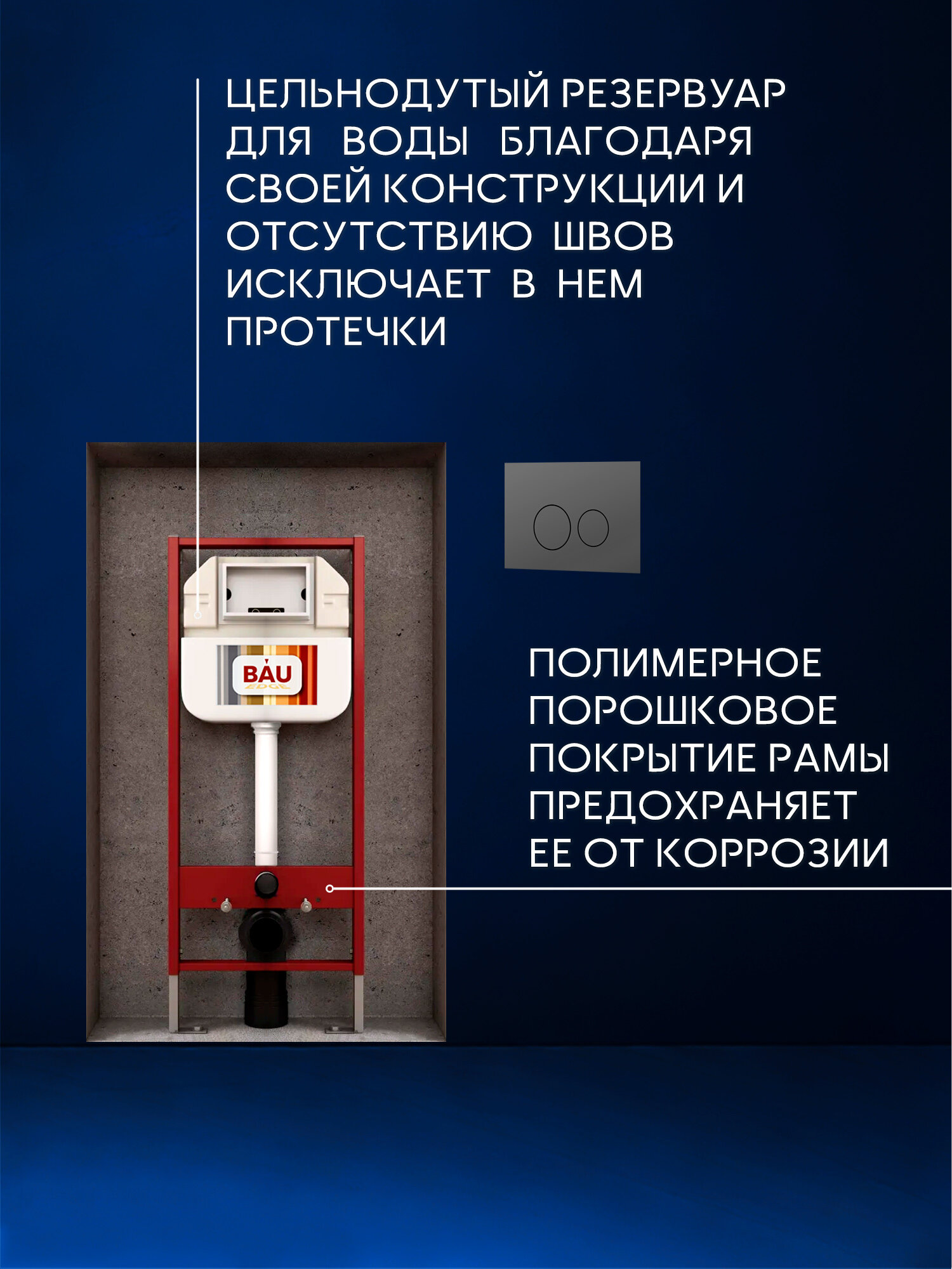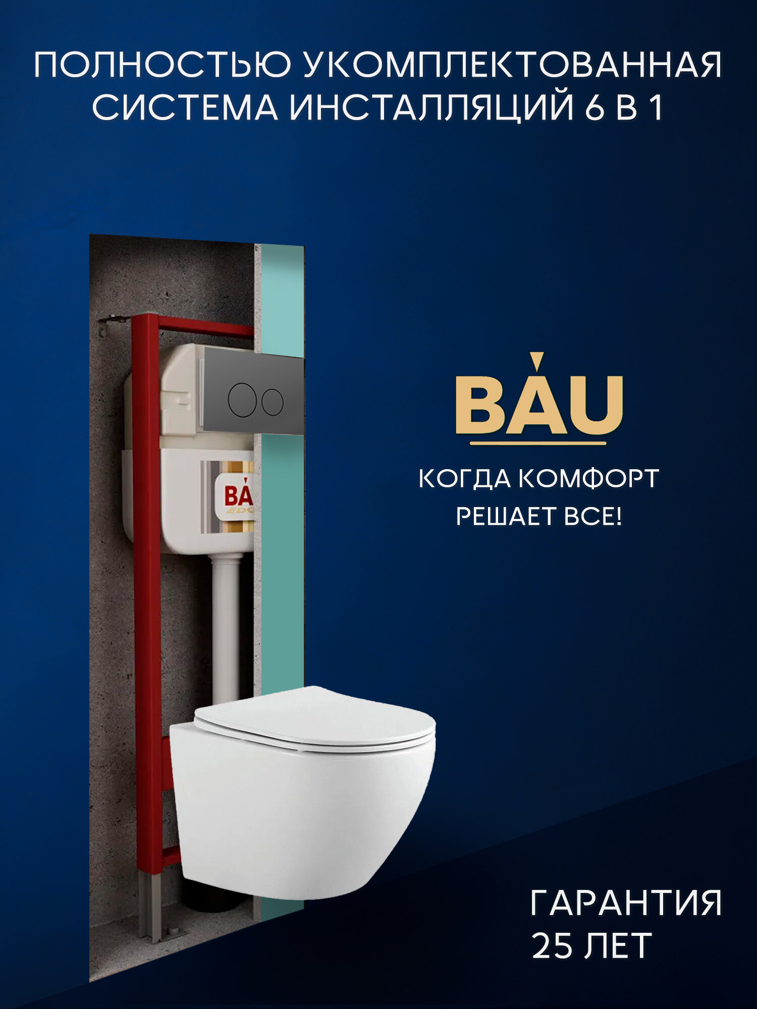 Комплект BAU 6 в 1: рамная инсталляция BAU NEO 45, унитаз подвесной безободковый вихревой Bau Dream Hurricane 49,5×36, быстросъемное тонкое сиденье дюропласт микролифт, кнопка смыва BAU Dream для инсталляции, серый матовый: сравнение цен, характеристики, фото, актуальное наличие и цены.
