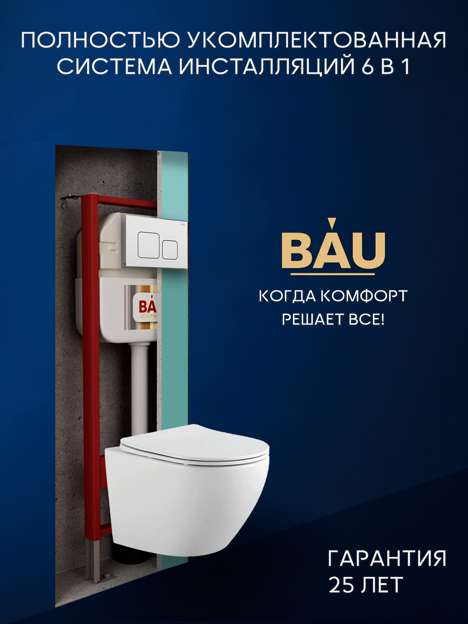 Купить Комплект BAU 6 в 1: рамная инсталляция BAU NEO 45, унитаз подвесной безободковый вихревой Bau Dream Hurricane 49,5×36, быстросъемное тонкое сиденье дюропласт микролифт, кнопка смыва BAU Soul для инсталляции, белая с доставкой по всей России.