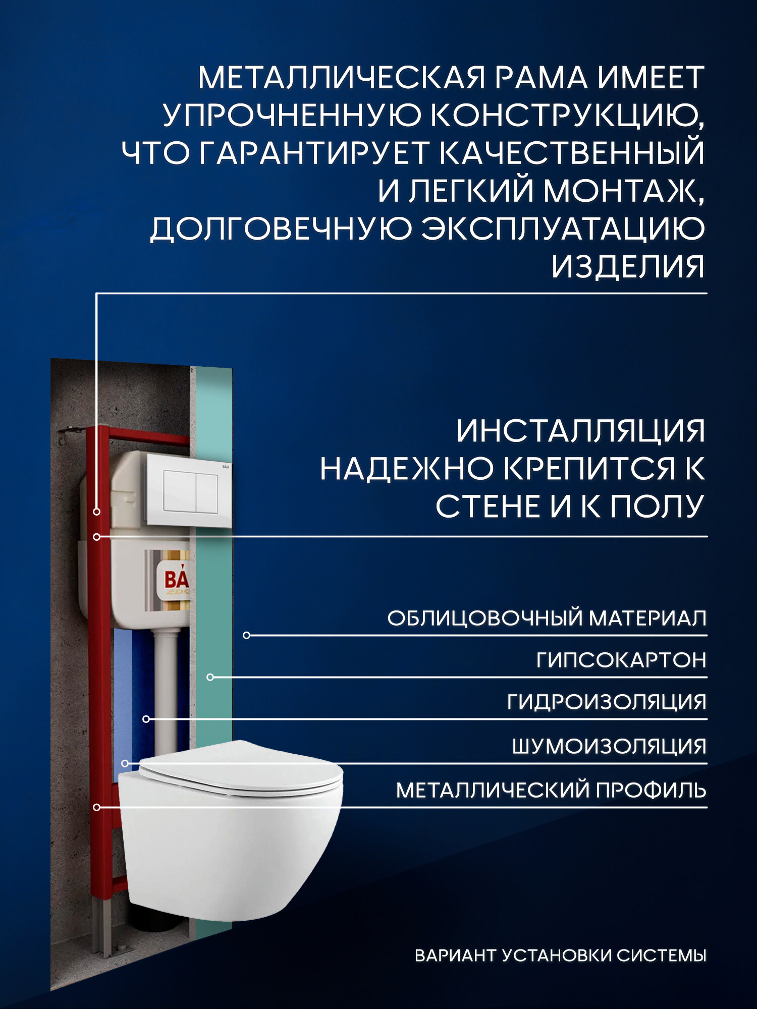 Купить Комплект BAU 6 в 1: рамная инсталляция BAU NEO 45, унитаз подвесной безободковый вихревой Bau Dream Hurricane 49,5×36, быстросъемное тонкое сиденье дюропласт микролифт, кнопка смыва BAU Stil для инсталляциии, белый глянец с доставкой по всей России.
