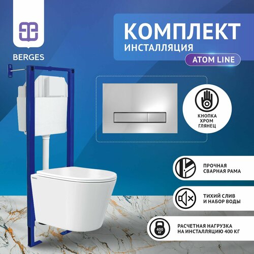 Купить Комплект BERGES: инсталляция кнопка хром глянец, унитаз 49 см, сиденье дюропласт микролифт, быстросъём с доставкой по всей России.
