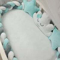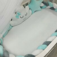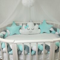 Комплект бортиков в кроватку для новорожденных, мягкая велюровая косичка и 3 подушки: облачко, звезды или милые зверушки из натурального хлопка (сатин). Множество расцветок помогут выбрать комплект как для девочки, так и для мальчика. Бортик коса заплетен в 3 пряди, высота 15см. Облачко и звезды высотой 35см. По бокам подушек прочные репсовые ленты для фиксации к стенкам кроватки, для косички также в комплекте ленточки, чтобы надежно зафиксировать бортик. Наши бортики создадут уютное пространство в кроватке младенца, надежно защитят от ударов о стенки и не дадут застрять ножке или ручке малыша между рейками кроватки. Бортики просты в уходе, чехлы несъемные, изделия можно и нужно стирать целиком, в стиральной машине на 30 градусов и минимальных оборотах на отжим. Качественный хлопковый велюр в косичке и натуральный сатин на игрушках выдержат множество стирок, не полиняют и не покроются катышками. Гипоаллергенный холлофайбер не комкуется, бортики не потеряют внешний вид после стирок, не требуют глажки, достаточно пройтись паром по сатиновым подушкам. Разные фактуры ткани подобраны не случайно, младенцам важно познавать мир тактильно и узнавать новые текстуры. Мы используем машинную вышивку на мордочках игрушек, вместо аппликаций, бусин и прочих мелких деталей, чтобы любознательные крохи не оторвали заинтересовавшие их вещи. Бортики в кроватку - прекрасный подарок на выписку, на рождение ребенка, молодой маме, внуку или внучке. Подходят для всех типов кроваток: круглой, овальной и прямоугольной.