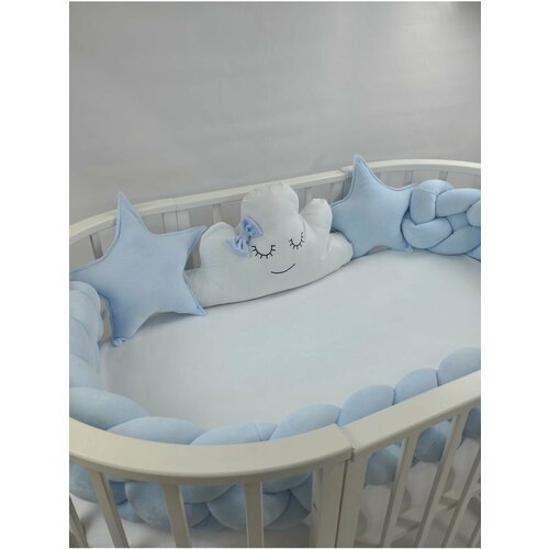 Бортики в кроватку любой формы. Комплект бортиков включает: Бортик коса в 4 пряди, длиной 230см и 3 или 4 бортика в виде зверушек (в зависимости от выбранной расцветки, точный состав комплекта смотрите на фото). Подушка облако, сова и зайка выполнены из хлопковой ткани, подушка звездочка и бортик косичка - из хлопкового велюра. Косичка закроет весь периметр круглой кроватки, а игрушки дополнят трансформацию овальной кроватки. Для прямоугольных кроваток 120/60 коса закрывает 3 стороны, а 4ую сторону закрывают игрушки. Каждая подушка-игрушка имеет завязки в виде прочных репсовых лент, для косички также прилагаются ленты в комплекте. Чехлы не снимаются, изделия можно стирать целиком в стиральной машине, инструкция по уходу внутри упаковки. Упакован комплект бортиков в сумочку с ручками для удобства хранения и транспортировки. Если Вы ищете что подарить на рождение девочки или мальчика, подарок на выписку - наш комплект оценят молодые мамы за дизайн, качество и функциональность, а младенцам понравится милые зверушки и приятный на ощупь велюр.