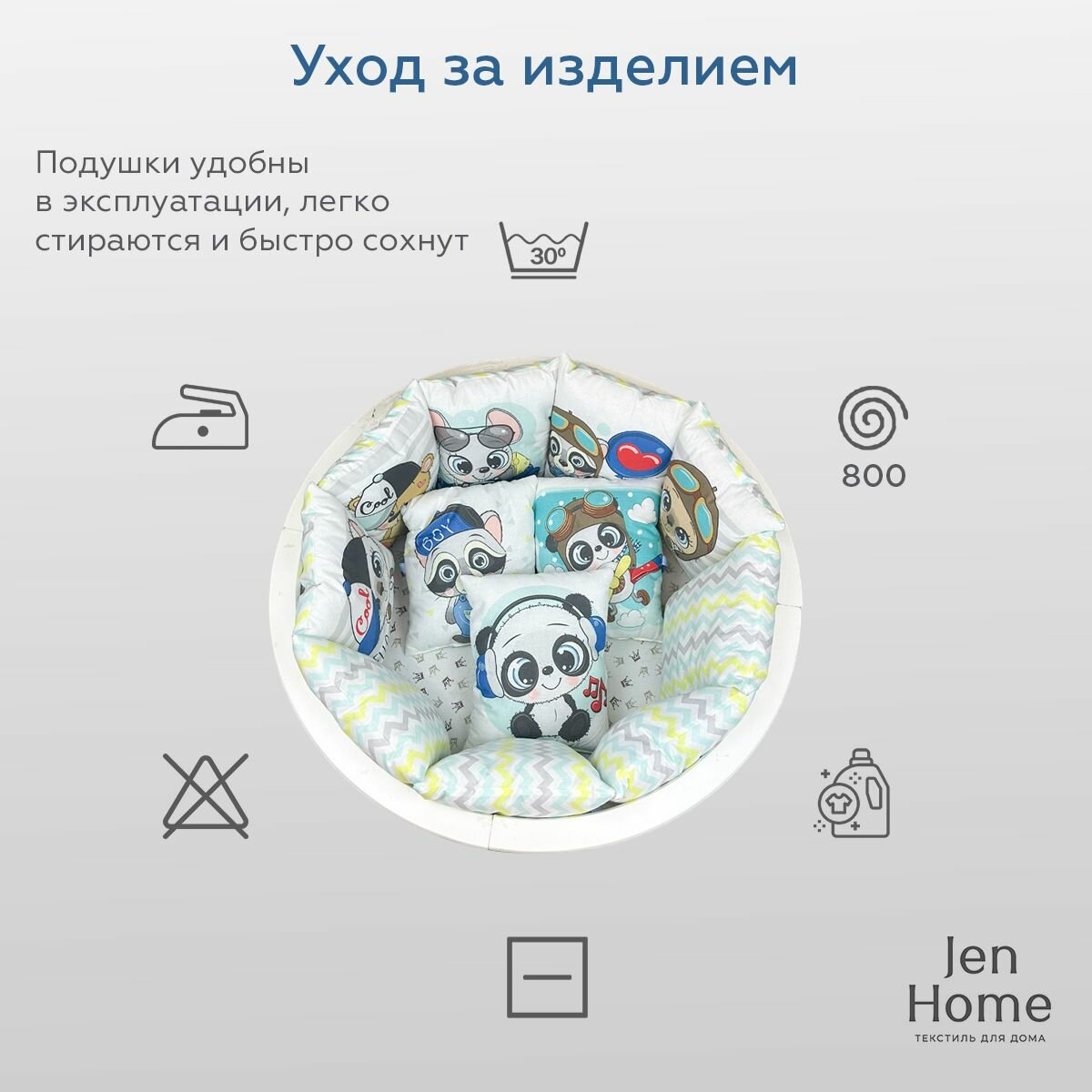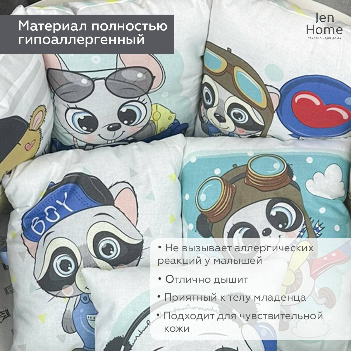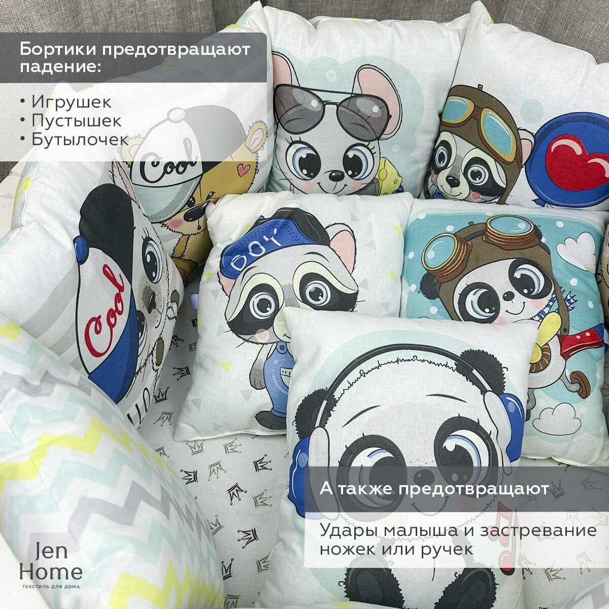 Комплект бортиков для кроватки состоит из 12 милых и веселых подушечек размером 27х30 см, из которых 8 имеют интересные декоративные рисунки. Это значит, что вы сможете выбрать наиболее подходящий вариант как для девочки, так и для мальчика. Рисунки выполнены с использованием ярких и привлекательных цветов, которыет понравятся вашему ребенку и создадут атмосферу радости и веселья в его комнате.