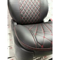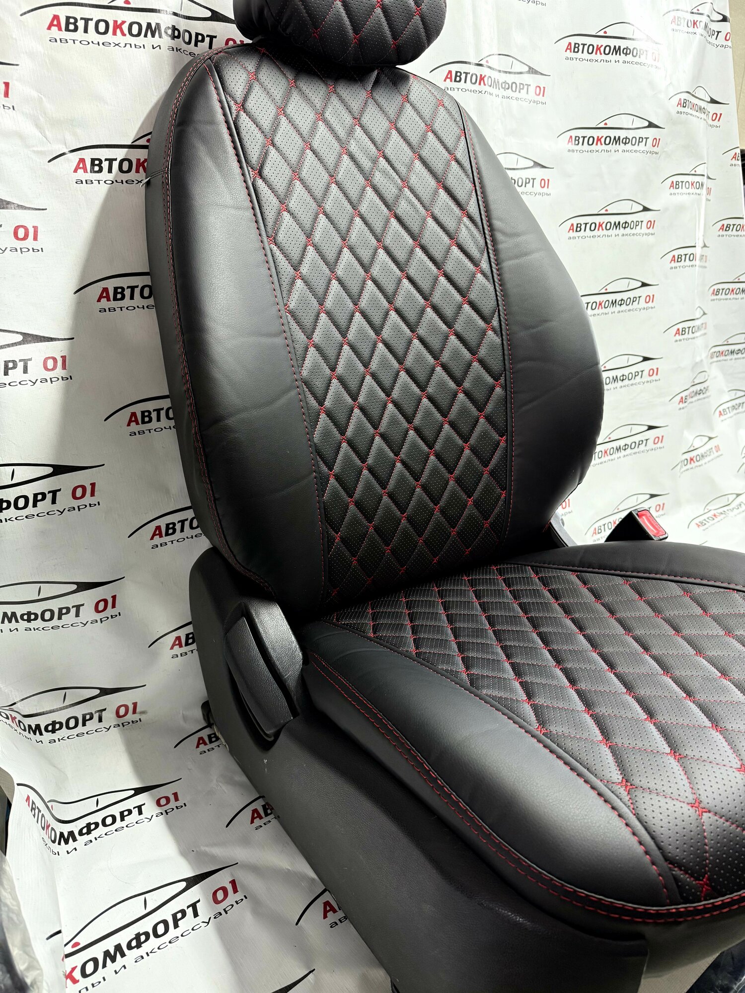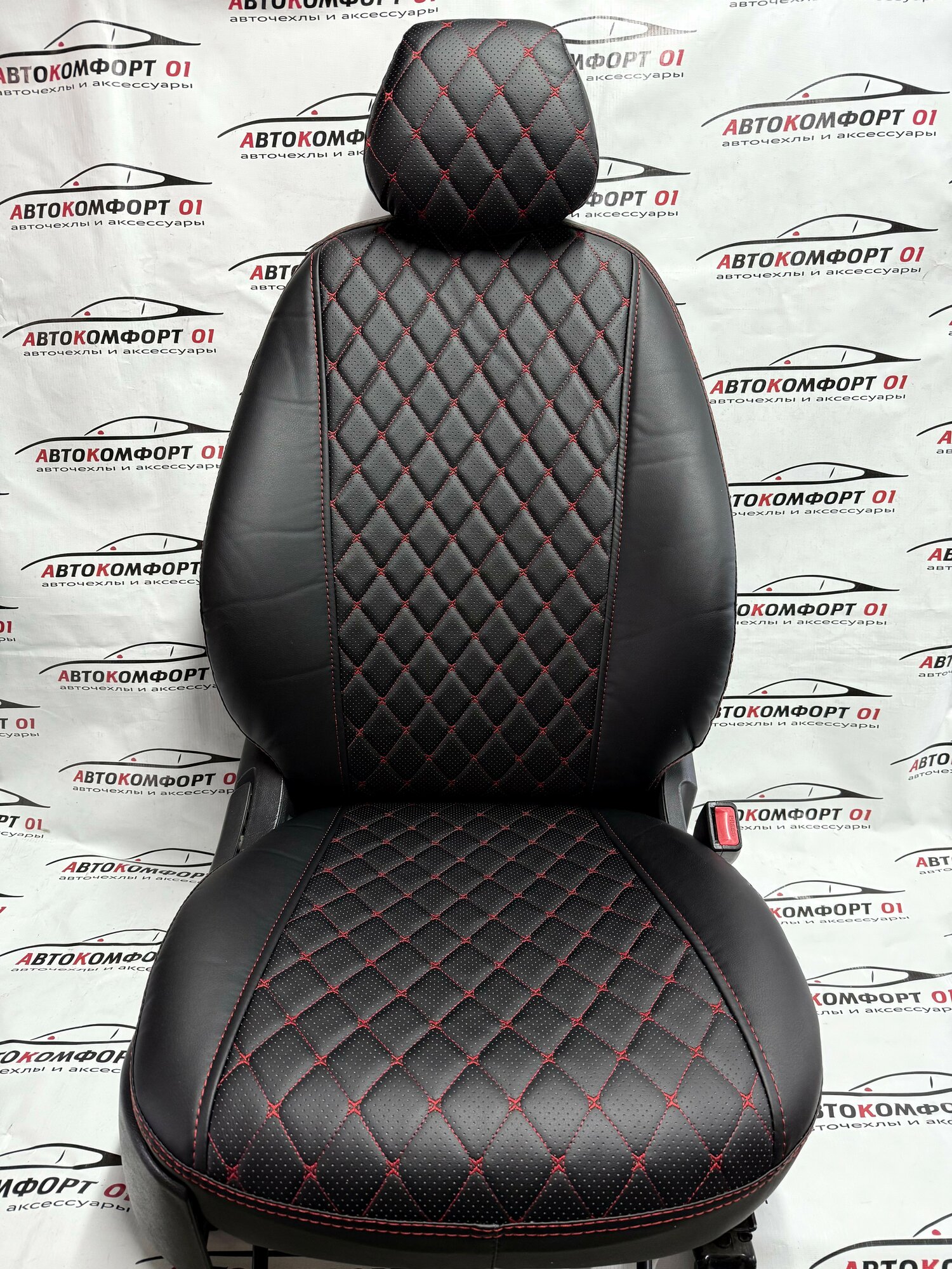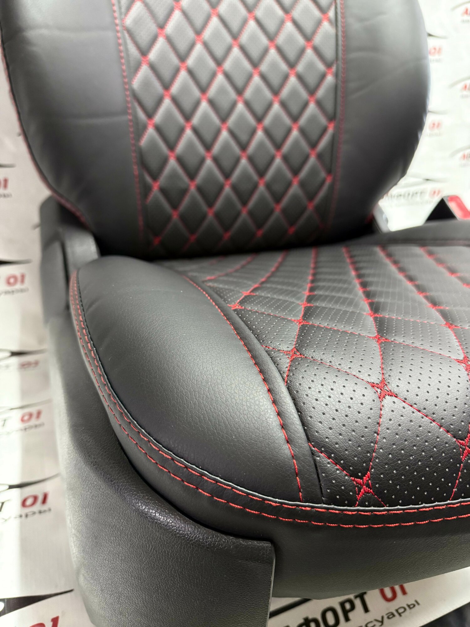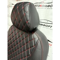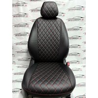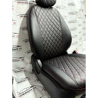Купить Комплект чехлов ELITE для LADA Granta, Kalina Cross, Datsun (Задняя спинка 40/60). Экокожа ромб, черный, красная строчка с доставкой по всей России.
