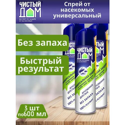 Аэрозоль Super Универсальная защита Чистый дом эффективно уничтожает: тараканов, муравьев, клопов, моль, мух, ос. Мгновенный эффект. Спокойная жизнь без насекомых.