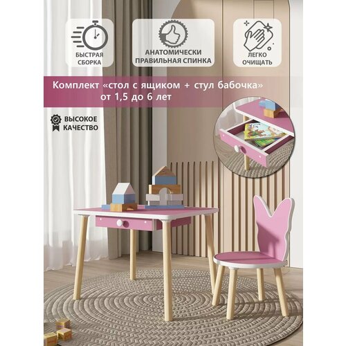 Стол и стул "Бабочка малиново-розовая". Стол уже собран на 99% (ящик собран ) и поэтому сборка займет пару минут, останется прикрутить ножки. Подходит для детей от 1,5 лет и до 6 лет. Столешница столика, сиденье и спинка стульчика сделаны из безопасного материала класса Е1, ножки из массива берёзы, гладкие, без покрытия. Углы столешницы закруглены и закрыты мягким мебельным кантом. Высота детского стола 46 см, размер столешницы 50х60 см. Высота детского стульчика 59 см (вместе со спинкой). Высота от пола до сиденья - 26 см. Удобно будет сидеть детям за данным комплектом ростом до 115 см. Детский стул и стол, комплект детской мебели, детская мебель, стол-пенал, детский стол пенал.