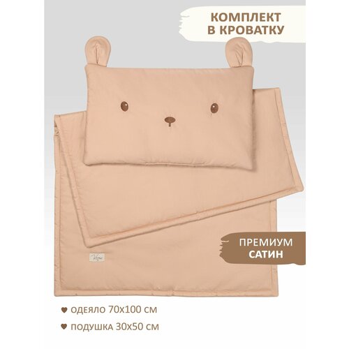 Комплект постельных принадлежностей для новорожденного ребенка: одеяло 70х100см и подушка 30х50 см с наполнителем синтепон. Этот набор выполнен из премиального сатина (100% хлопок) специально для комфортного сна ребенка. Ткань сатин имеет множество преимуществ, особенно для новорожденных, вот основные из них: натуральность и гипоаллергенность не содержит вредных химических добавок. Ткань отлично пропускает воздух, что способствует поддержанию оптимальной температуры тела малыша. Сатин обеспечивает хорошую вентиляцию и впитывает влагу, что помогает быстро отводить пот и предотвращает опрелости. Это особенно важно для комфорта новорожденного во время сна. Постельные принадлежности предназначены для использования в кроватках новорожденных малышей. Однотонное спальное белье выдержит много стирок, устойчив к катышкам, впитывает влагу и дышит. Комплект белья не обязательно гладить, так как он отлично держит форму после стирок. Одеяло можно использовать как плед или покрывало на кровать. Подарочный комплект подходит для использования в разные сезоны, а особенно комплект будет актуален, когда зима, осень или холодная весна. Хлопковое зимнее одеяло обеспечит тепло в холодное время года и благоприятную температуру в теплую погоду. Подушечка подарит малышу еще больше комфорта и поддержки во время сна. Набор постельного белья выполнен из пастельного бежевого сатина и будет прекрасно гармонировать как с детской комнатой малыша, так и с любым интерьером вашего дома. Подушка оформлена милыми ушками и вышивкой в виде медвежонка, а мягкое декоративное одеяльце с жаккардовым логотипом дополняет комплект. Наш комплект постельных принадлежностей подарит радость малышам и взрослым. Односпальное всесезонное белье для новорожденных приятное на ощупь, выполнено с особым вниманием к деталям, чтобы ваш малыш чувствовал себя в безопасности. Тонкое облегченное одеяло с понравится каждому ребенку. Комплект постельного белья создан специально для детей первых месяцев жизни и отвечает всем требованиям комфорта и качества. Используя этот утепленный набор зимой, вы обеспечите своего младенца легким и теплым сном в любое время года. Идеально подходит в качестве подарка на выписку.