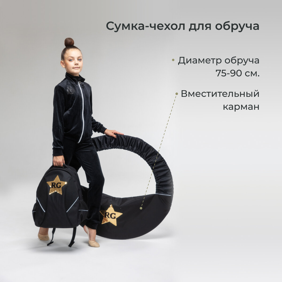 Сумка чехол на обруч для всех гимнастических предметов. Подойдет для обруча размером от 75 до 90 см. Сумка чехол для обруча имеет светоотражающие элементы и 2 больших кармана на молнии с двумя отделами, куда можно убрать всё самое необходимое.