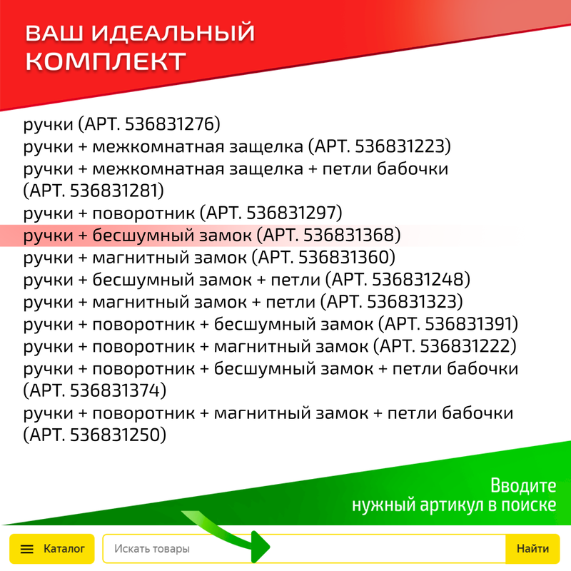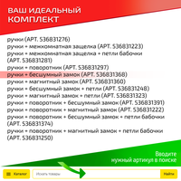 | Дополнительная информация | в состав комплекта, входят только ручк. замок, защёлки и завёртки приобретаются отдельно |