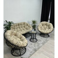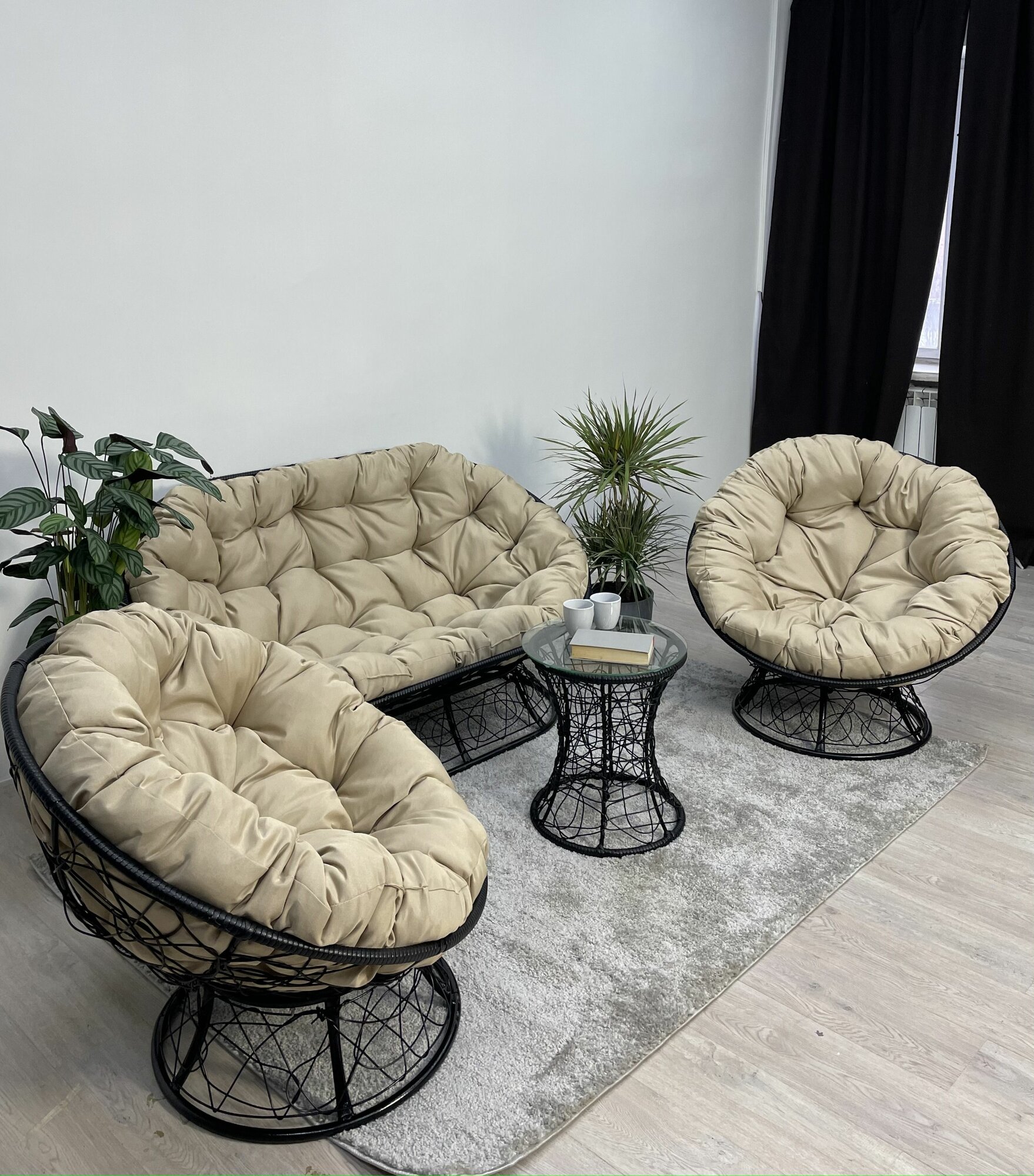 Комплект для отдыха папасан плюс черный: диван, столик, 2 кресла, 3 подушки (бежевый полиэстер)
