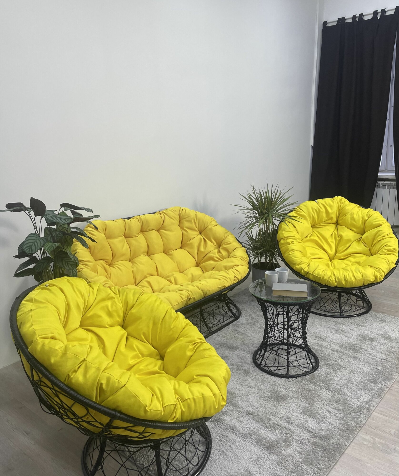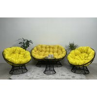 Комплект для отдыха папасан плюс черный: диван, столик, 2 кресла, 3 подушки (желтый полиэстер)