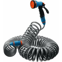 Особенности, Преимущества: Спиральный шланг идеально подходит для полива в ограниченном пространстве. Регулировка полива осуществляется путем выбора одного из 7 режимов полива: душ, аэрирование, слабая струя, конус, центр, плоская струя, жесткая струя. Пистолет-распылитель оснащен фиксатором для непрерывного полива. Эргономичная рукоятка имеет мягкое ребристое покрытие из термопластичной резины для удобства работы. Комплектация набора позволяет подключить спиральный шланг к водопроводному крану или трубе с внешней резьбой 3/4" или 1/2"