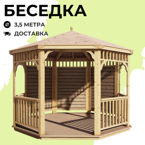 Параметры беседки: · Форма восьмигранная · Размер d 3,5 м · Площадь 8,7 кв. м. (по стойкам) · Высота в коньке 2,9 м · Материал сухая строганная сосна, влажность 12-14%, сорт АБ