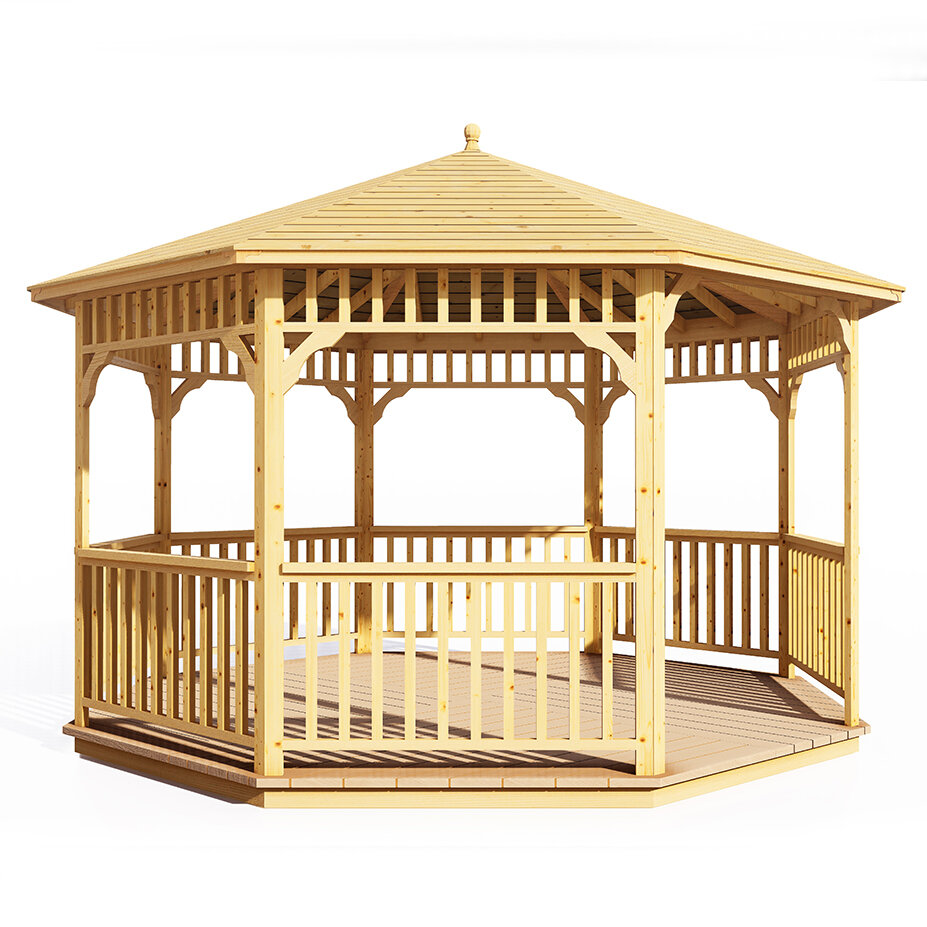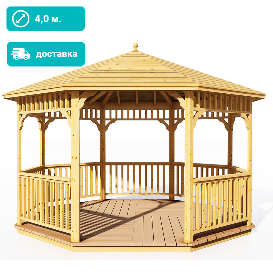 Параметры беседки: · Форма восьмигранная · Размер d 4 м · Площадь 11,3 кв. м. (по стойкам) · Высота в коньке 3,03 м · Материал сухая строганная сосна, влажность 12-14%, сорт АБ