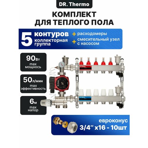 Комплект для теплого пола на 5 контуров: с расходомерами, насос циркуляционный GRUNDFOS UPS25-60 130 (без гаек), насосно-смесительный узел 130 мм с термоголовкой и евроконусами 16х2.0 (до 70 кв/м): сравнение цен, характеристики, фото, актуальное наличие и цены.