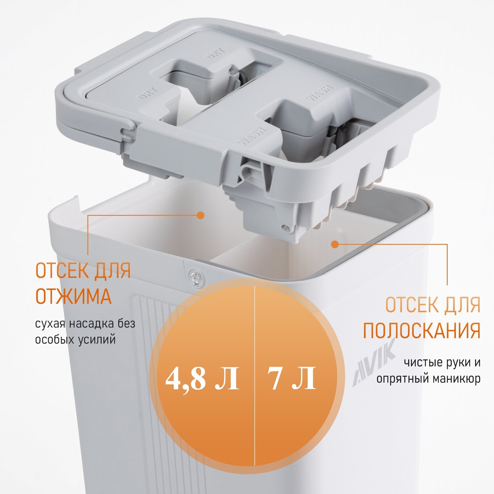 8) Удобное ведро: не перевешивает, хорошо держит баланс при переноске. Ведро состоит из двух изолированных отсеков: отжим и полоскание (объём каждого отсека - 4,5 литров). Отсек, предназначенный для полоскания, оснащен зубчиками, которые позволяют очищать насадку, задерживая мусор (пыль, волосы и т. д.);