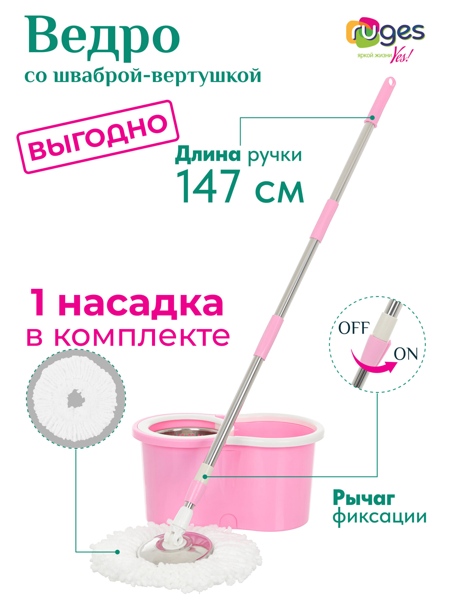 Купить Комплект для уборки RUGES: швабра с отжимом и ведром (147 см ручка + 1 насадка) / швабра лентяйка вертушка / темно-зеленая с доставкой по всей России.