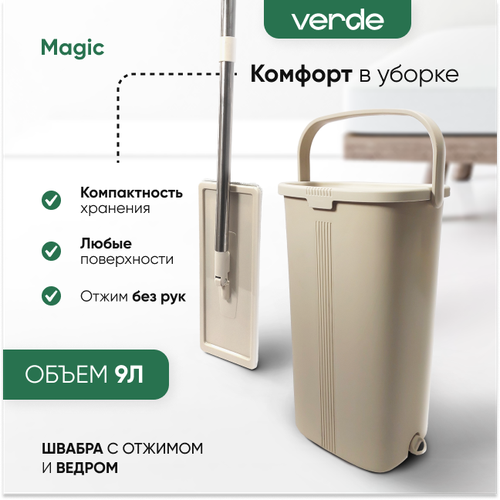 Это абсолютно уникальный и безопасный товар со 100% эффективностью. Благодаря инновационному дизайну, швабра сама очищается и выжимает лишнюю воду без необходимости физического касания. Комплект для уборки от компании “VERDE” эффективен для быстрой и лёгкой уборки вашего дома или офиса. Ткань из микрофибры очищает грязь, пыль и прочий мусор с любых твердых поверхностей.
